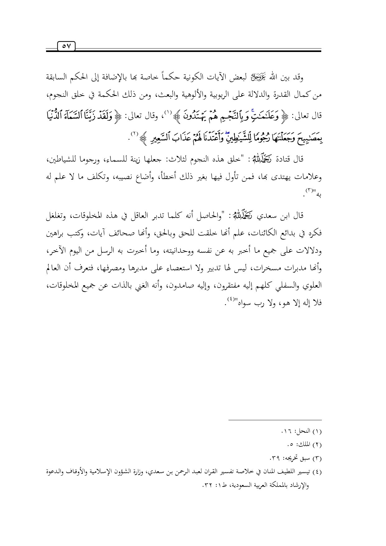 وقد بين الله -عز وجل- لبعض الآيات الكونية حكماً خاصة بها بالإضافة إلى الحكم السابقة من كمال القدرة والدلالة على الربوبية والألوهية والبعث، ومن ذلك الحكمة في خلق النجوم، قال تعالى: {وَعَلَامَاتٍ وَبِالنَّجْمِ هُمْ يَهْتَدُونَ} (¬1)، وقال تعالى: {وَلَقَدْ زَيَّنَّا السَّمَاءَ الدُّنْيَا بِمَصَابِيحَ وَجَعَلْنَاهَا رُجُومًا لِلشَّيَاطِينِ وَأَعْتَدْنَا لَهُمْ عَذَابَ السَّعِيرِ} (¬2).