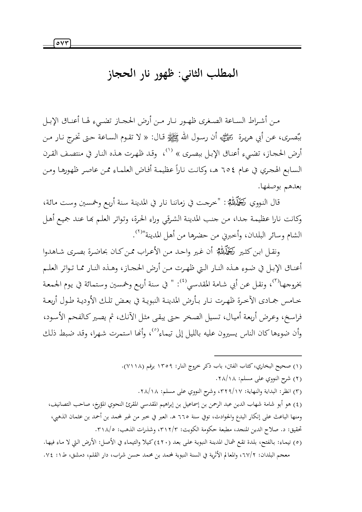 ونقل ابن كثير -رحمه الله- أن غير واحد من الأعراب ممن كان بحاضرة بصرى شاهدوا أعناق الإبل في ضوء هذه النار التي ظهرت من أرض الحجاز، وهذه النار مما تواتر العلم بخروجها (¬3)، ونقل عن أبي شامة المقدسي (¬4): " في سنة أربع وخمسين وستمائة في يوم الجمعة خامس جمادى الآخرة ظهرت نار بأرض المدينة النبوية في بعض تلك الأودية طول أربعة فراسخ، وعرض أربعة أميال، تسيل الصخر حتى يبقى مثل الآنك، ثم يصير كالفحم الأسود، وأن ضوءها كان الناس يسيرون عليه بالليل إلى تيماء (¬5)، وأنها استمرت شهرا، وقد ضبط ذلك