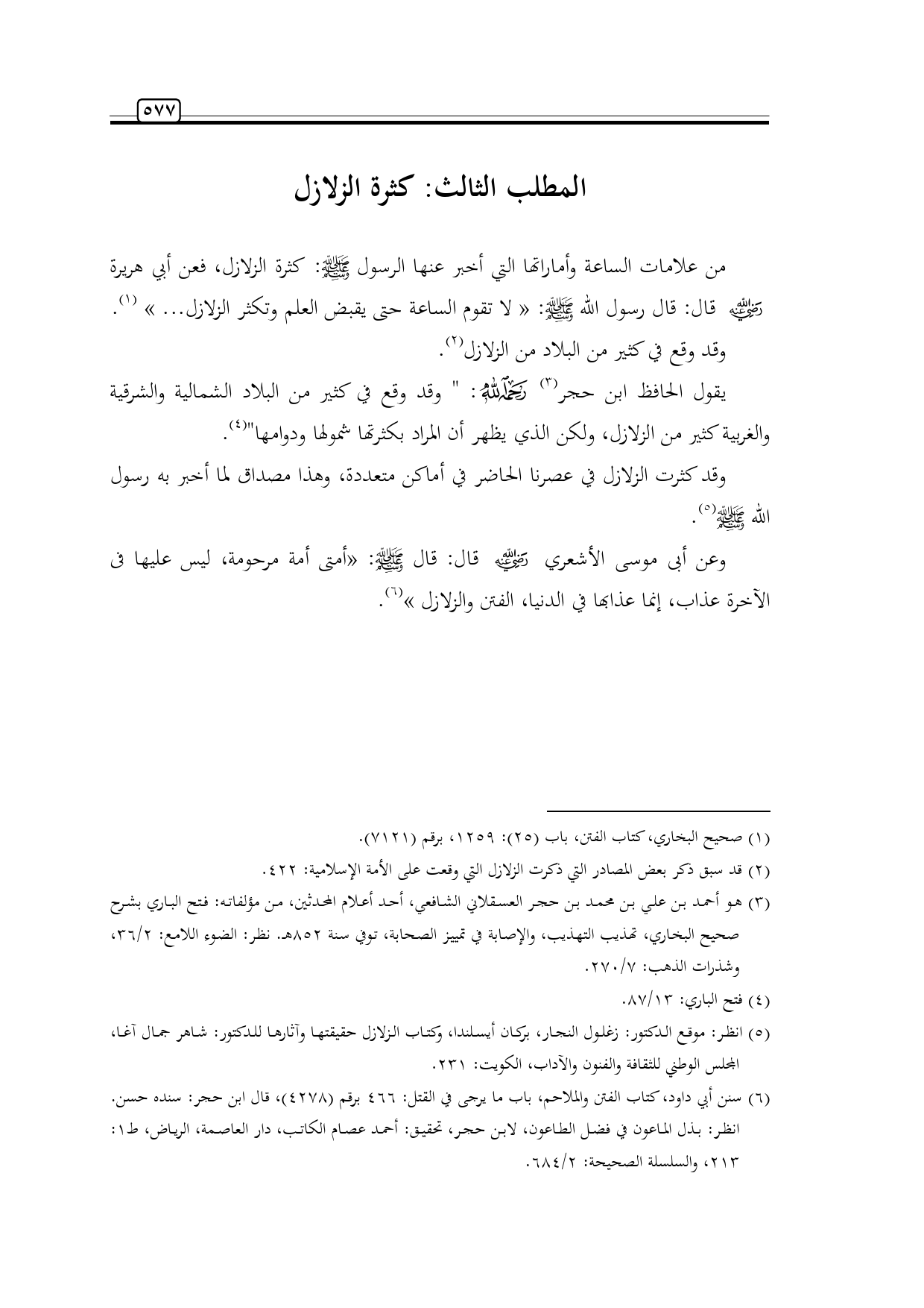 يقول الحافظ ابن حجر (¬3) -رحمه الله-: " وقد وقع في كثير من البلاد الشمالية والشرقية والغربية كثير من الزلازل، ولكن الذي يظهر أن المراد بكثرتها شمولها ودوامها" (¬4).