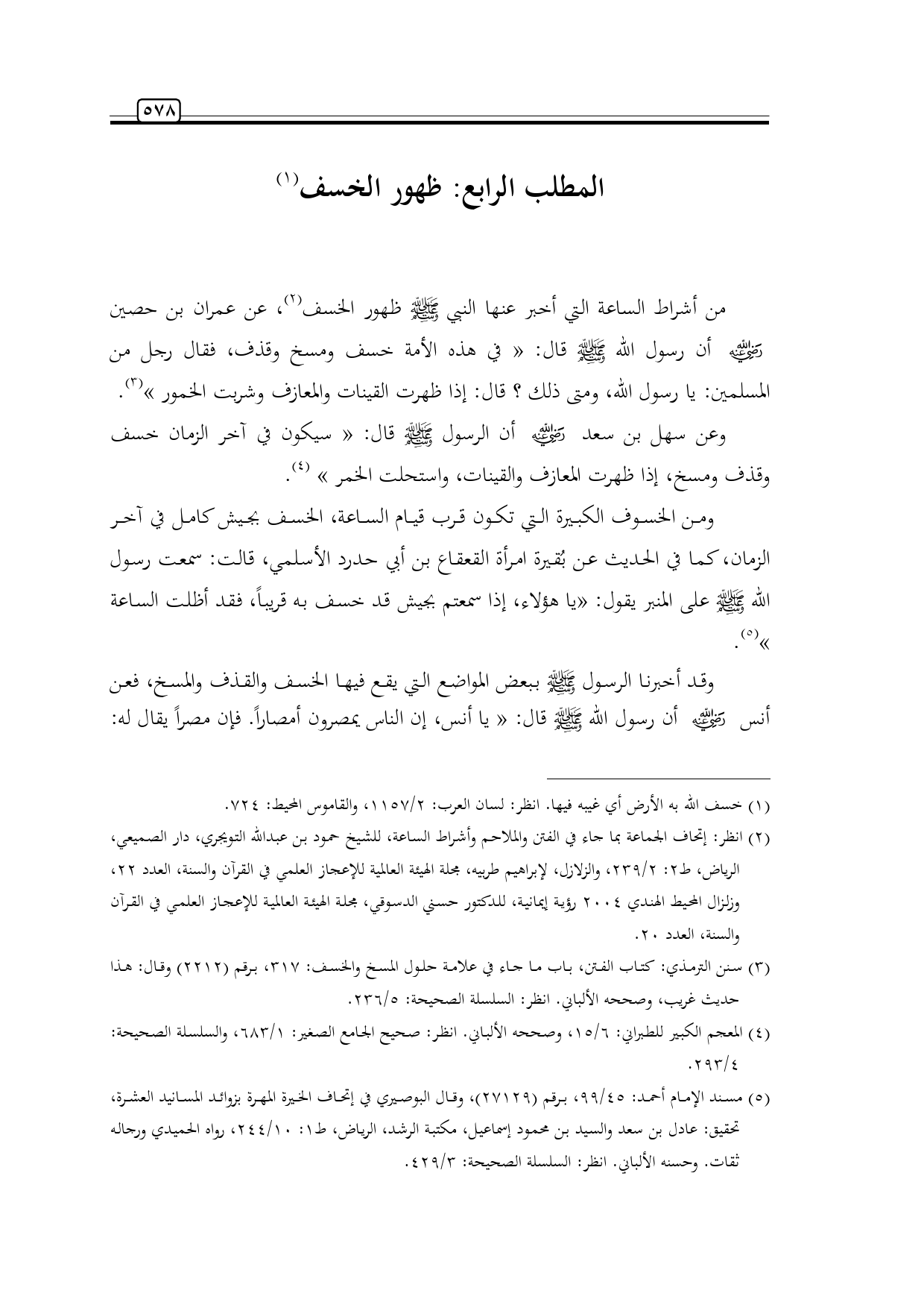 من أشراط الساعة التي أخبر عنها النبي -صلى الله عليه وسلم- ظهور الخسف (¬2)، عن عمران بن حصين -رضي الله عنه- أن رسول الله -صلى الله عليه وسلم- قال: «في هذه الأمة خسف ومسخ وقذف، فقال رجل من المسلمين: يا رسول الله، ومتى ذلك؟ قال: إذا ظهرت القينات والمعازف وشربت الخمور» (¬3).