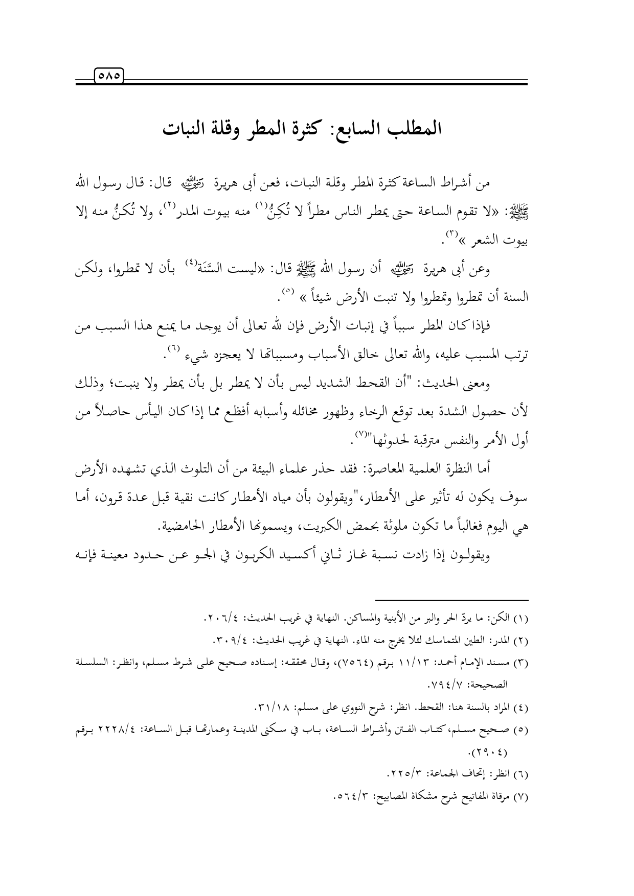 من أشراط الساعة كثرة المطر وقلة النبات، فعن أبى هريرة -رضي الله عنه- قال: قال رسول الله -صلى الله عليه وسلم-: «لا تقوم الساعة حتى يمطر الناس مطراً لا تُكِنُّ (¬1) منه بيوت المدر (¬2)، ولا تُكنُّ منه إلا بيوت الشعر» (¬3).
