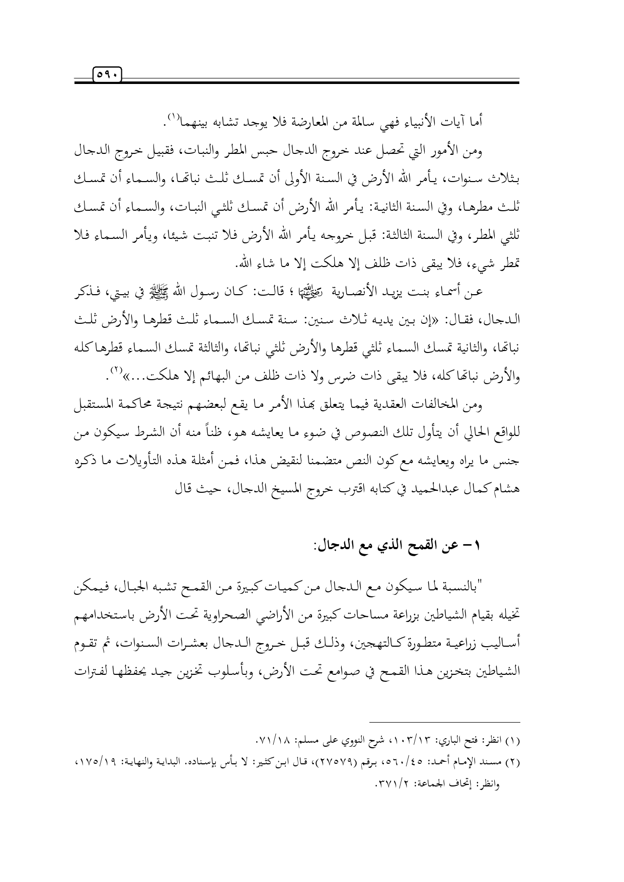 "بالنسبة لما سيكون مع الدجال من كميات كبيرة من القمح تشبه الجبال، فيمكن تخيله بقيام الشياطين بزراعة مساحات كبيرة من الأراضي الصحراوية تحت الأرض باستخدامهم أساليب زراعية متطورة كالتهجين، وذلك قبل خروج الدجال بعشرات السنوات، ثم تقوم الشياطين بتخزين هذا القمح في صوامع تحت الأرض، وبأسلوب تخزين جيد يحفظها لفترات