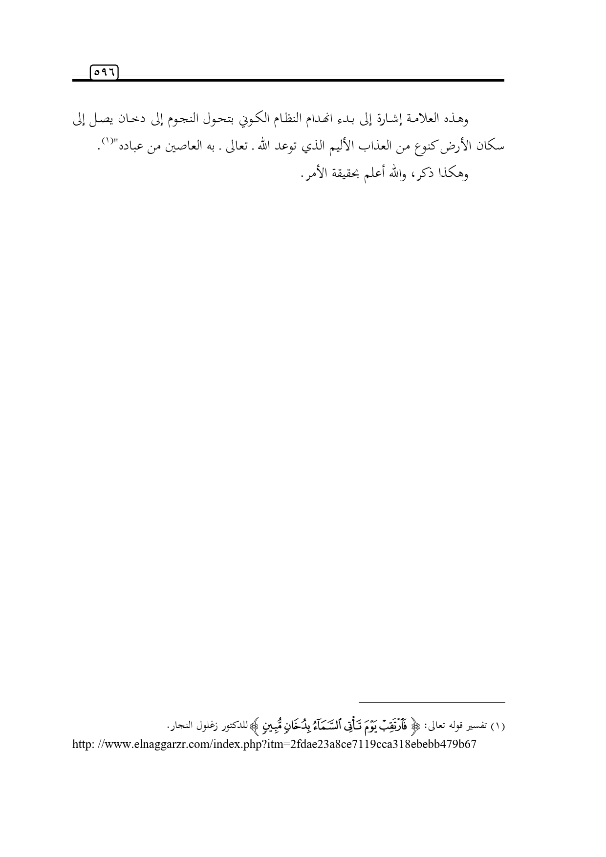 وهذه العلامة إشارة إلى بدء انهدام النظام الكوني بتحول النجوم إلى دخان يصل إلى سكان الأرض كنوع من العذاب الأليم الذي توعد الله ـ تعالى ـ به العاصين من عباده" (¬1).