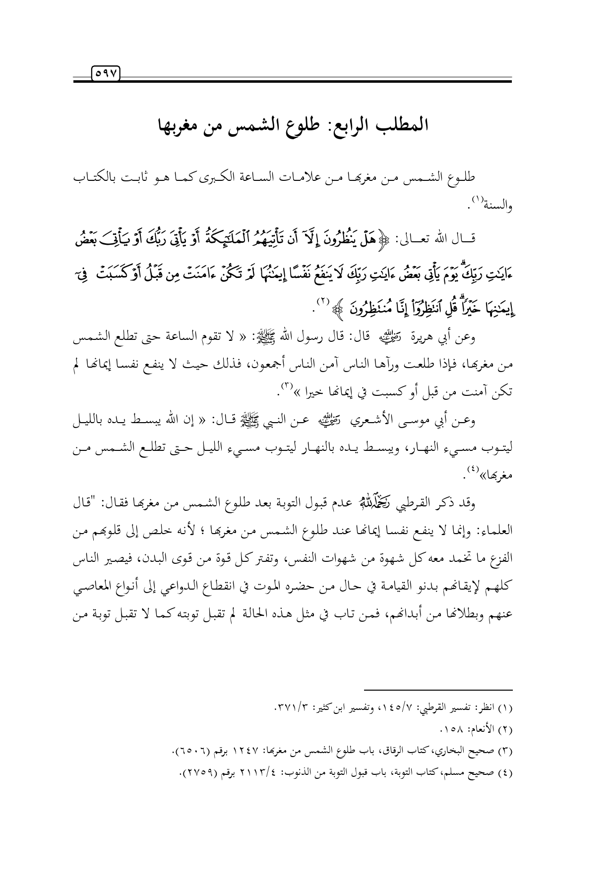 وعن أبي هريرة -رضي الله عنه- قال: قال رسول الله -صلى الله عليه وسلم-: «لا تقوم الساعة حتى تطلع الشمس من مغربها، فإذا طلعت ورآها الناس آمن الناس أجمعون، فذلك حيث لا ينفع نفسا إيمانها لم تكن آمنت من قبل أو كسبت في إيمانها خيرا» (¬3).