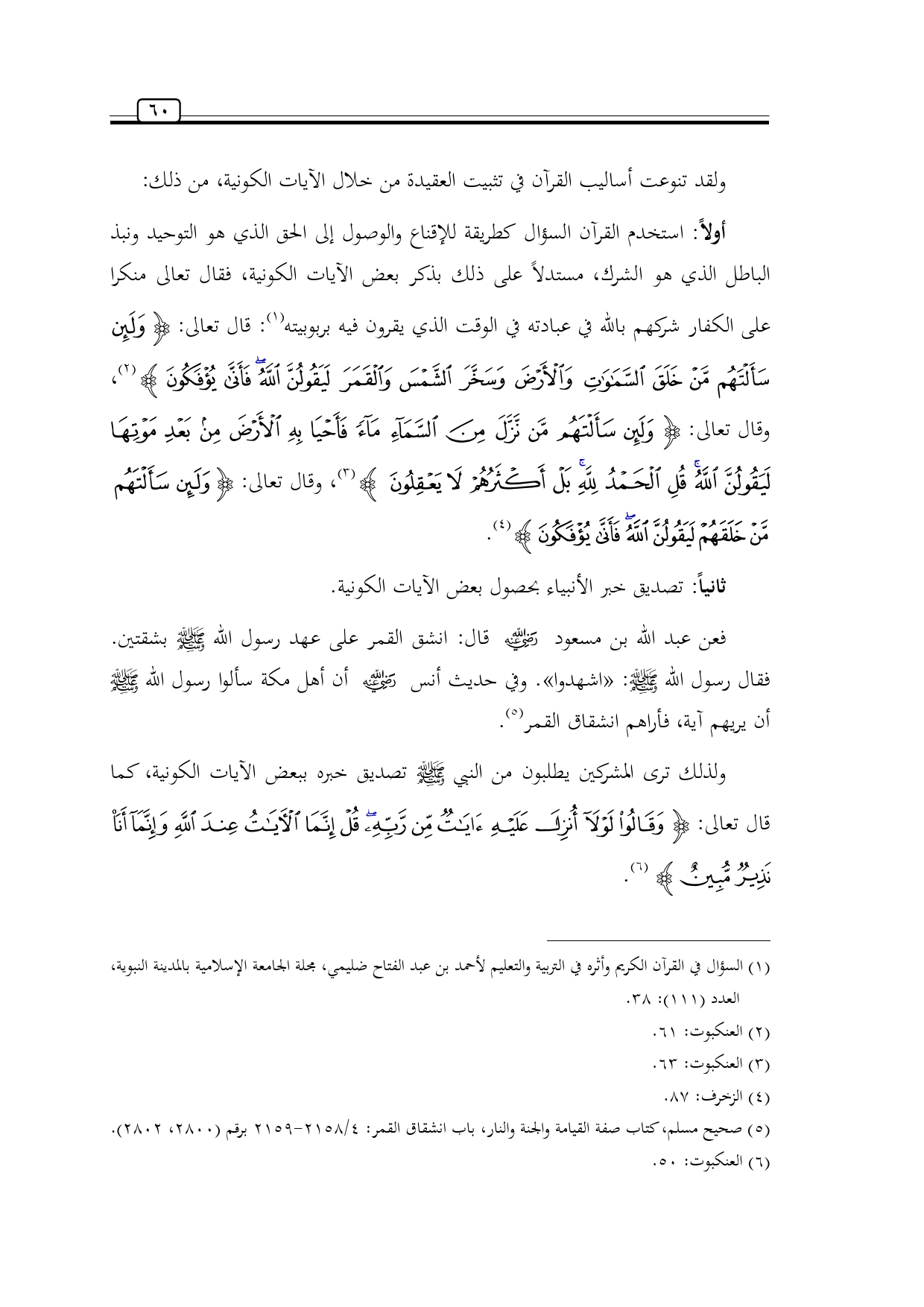 أولاً: استخدم القرآن السؤال كطريقة للإقناع والوصول إلى الحق الذي هو التوحيد ونبذ الباطل الذي هو الشرك، مستدلاً على ذلك بذكر بعض الآيات الكونية، فقال تعالى منكرا على الكفار شركهم بالله في عبادته في الوقت الذي يقرون فيه بربوبيته (¬1): قال تعالى: {وَلَئِنْ سَأَلْتَهُمْ مَنْ خَلَقَ السَّمَاوَاتِ وَالْأَرْضَ وَسَخَّرَ الشَّمْسَ وَالْقَمَرَ لَيَقُولُنَّ اللَّهُ فَأَنَّى يُؤْفَكُونَ} (¬2)، وقال تعالى: {وَلَئِنْ سَأَلْتَهُمْ مَنْ نَزَّلَ مِنَ السَّمَاءِ مَاءً فَأَحْيَا بِهِ الْأَرْضَ مِنْ بَعْدِ مَوْتِهَا لَيَقُولُنَّ اللَّهُ قُلِ الْحَمْدُ لِلَّهِ بَلْ أَكْثَرُهُمْ لَا يَعْقِلُونَ} (¬3)، وقال تعالى: {وَلَئِنْ سَأَلْتَهُمْ مَنْ خَلَقَهُمْ لَيَقُولُنَّ اللَّهُ فَأَنَّى يُؤْفَكُونَ} (¬4).