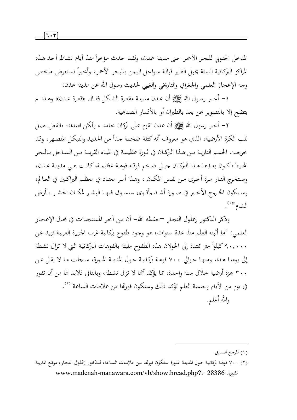 (¬2) 700 فوهة بركانية حول المدينة المنورة ستكون فورتها من علامات الساعة، للدكتور زغلول النجار، موقع المدينة المنورة. www.madenah-manawara.com/vb/showthread.php? - رحمه الله- =28386
