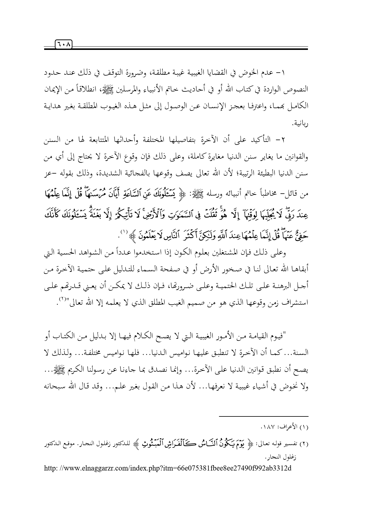 وعلى ذلك فإن المشتغلين بعلوم الكون إذا استخدموا عدداً من الشواهد الحسية التي أبقاها الله تعالى لنا في صخور الأرض أو في صفحة السماء للتدليل على حتمية الآخرة من أجل البرهنة على تلك الحتمية وعلى ضرورتها، فإن ذلك لا يمكن أن يعني قدرتهم على استشراف زمن وقوعها الذي هو من صميم الغيب المطلق الذي لا يعلمه إلا الله تعالى" (¬2).