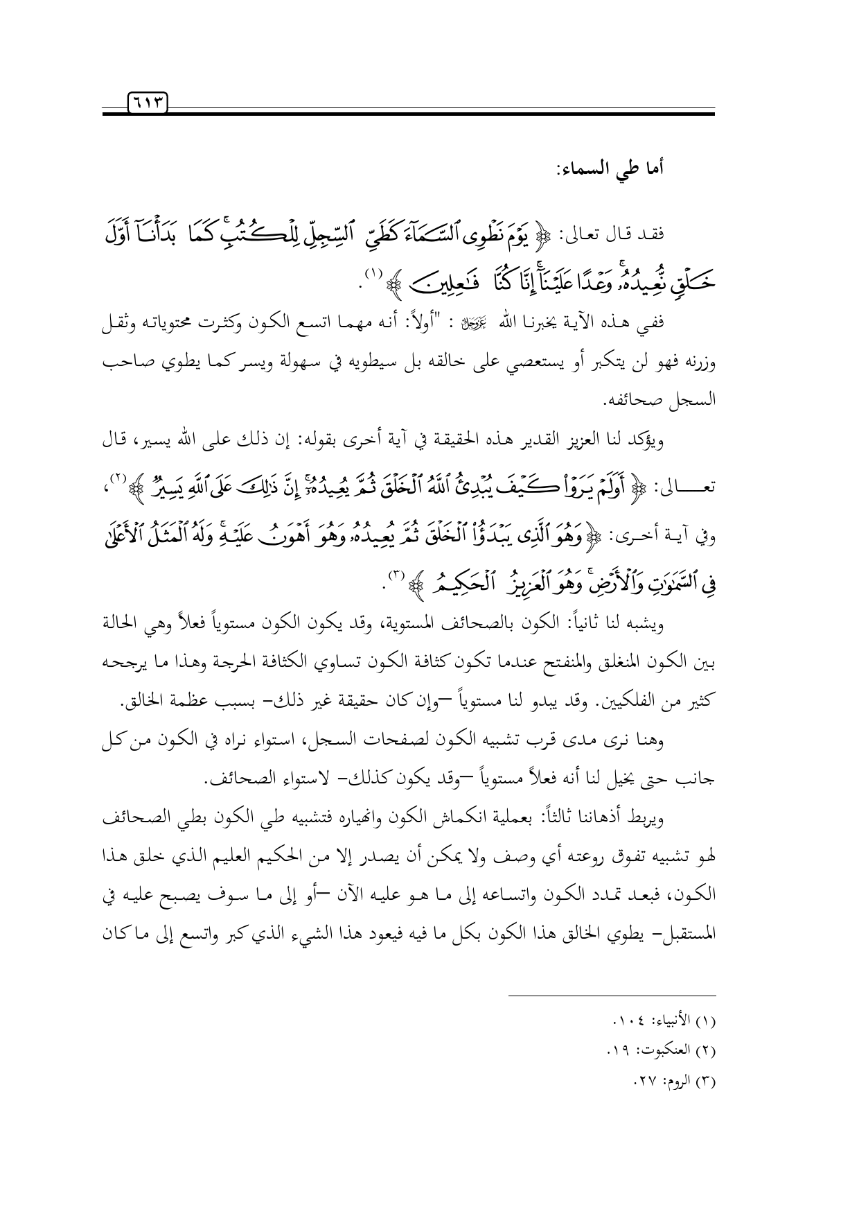 فقد قال تعالى: {يَوْمَ نَطْوِي السَّمَاءَ كَطَيِّ السِّجِلِّ لِلْكُتُبِ كَمَا بَدَأْنَا أَوَّلَ خَلْقٍ نُعِيدُهُ وَعْدًا عَلَيْنَا إِنَّا كُنَّا فَاعِلِينَ} (¬1).