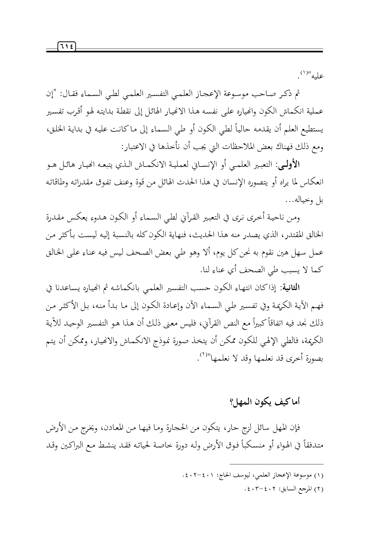 ثم ذكر صاحب موسوعة الإعجاز العلمي التفسير العلمي لطي السماء فقال: "إن عملية انكماش الكون وانهياره على نفسه هذا الانهيار الهائل إلى نقطة بدايته لهو أقرب تفسير يستطيع العلم أن يقدمه حالياً لطي الكون أو طي السماء إلى ما كانت عليه في بداية الخلق، ومع ذلك فهناك بعض الملاحظات التي يجب أن نأخذها في الاعتبار: