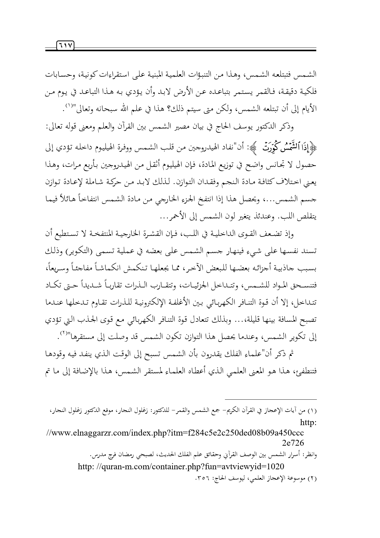 وذكر الدكتور يوسف الحاج في بيان مصير الشمس بين القرآن والعلم ومعنى قوله تعالى: {إِذَا الشَّمْسُ كُوِّرَتْ: أن"نفاد الهيدروجين من قلب الشمس ووفرة الهيليوم داخله تؤدي إلى حصول لا تجانس واضح في توزيع المادة، فإن الهيليوم أثقل من الهيدروجين بأربع مرات، وهذا يعني اختلاف كثافة مادة النجم وفقدان التوازن. لذلك لابد من حركة شاملة لإعادة توازن جسم الشمس ... ، ويحصل هذا إذا انتفخ الجزء الخارجي من مادة الشمس انتفاخاً هائلاً فيما يتقلص اللب. وعندئذ يتغير لون الشمس إلى الأحمر ...