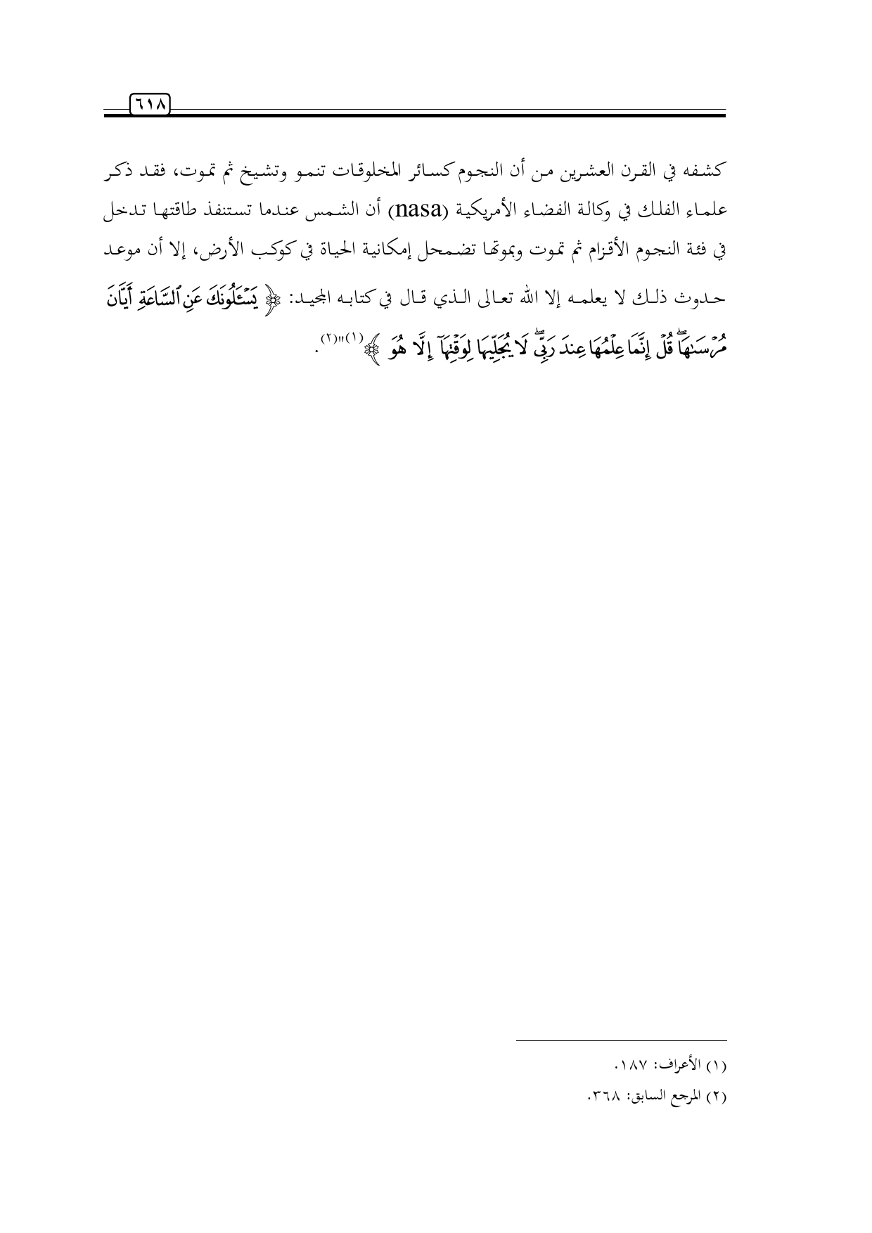 كشفه في القرن العشرين من أن النجوم كسائر المخلوقات تنمو وتشيخ ثم تموت، فقد ذكر علماء الفلك في وكالة الفضاء الأمريكية ( nasa) أن الشمس عندما تستنفذ طاقتها تدخل في فئة النجوم الأقزام ثم تموت وبموتها تضمحل إمكانية الحياة في كوكب الأرض، إلا أن موعد حدوث ذلك لا يعلمه إلا الله تعالى الذي قال في كتابه المجيد: {يَسْأَلُونَكَ عَنِ السَّاعَةِ أَيَّانَ مُرْسَاهَا قُلْ إِنَّمَا عِلْمُهَا عِنْدَ رَبِّي لَا يُجَلِّيهَا لِوَقْتِهَا إِلَّا هُوَ} (¬1) " (¬2).