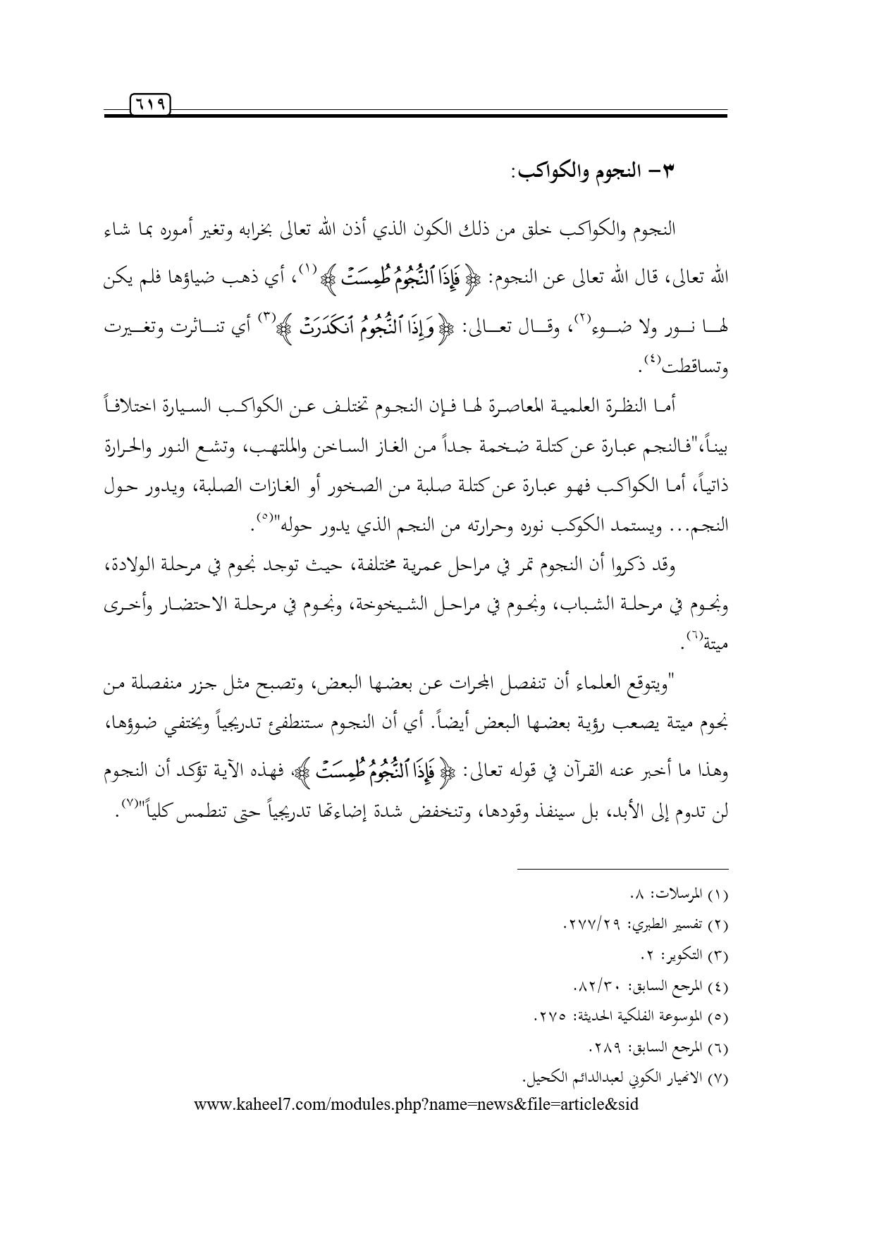 النجوم والكواكب خلق من ذلك الكون الذي أذن الله تعالى بخرابه وتغير أموره بما شاء الله تعالى، قال الله تعالى عن النجوم: {فَإِذَا النُّجُومُ طُمِسَتْ} (¬1)، أي ذهب ضياؤها فلم يكن لها نور ولا ضوء (¬2)، وقال تعالى: {وَإِذَا النُّجُومُ انْكَدَرَتْ} (¬3) أي تناثرت وتغيرت وتساقطت (¬4).