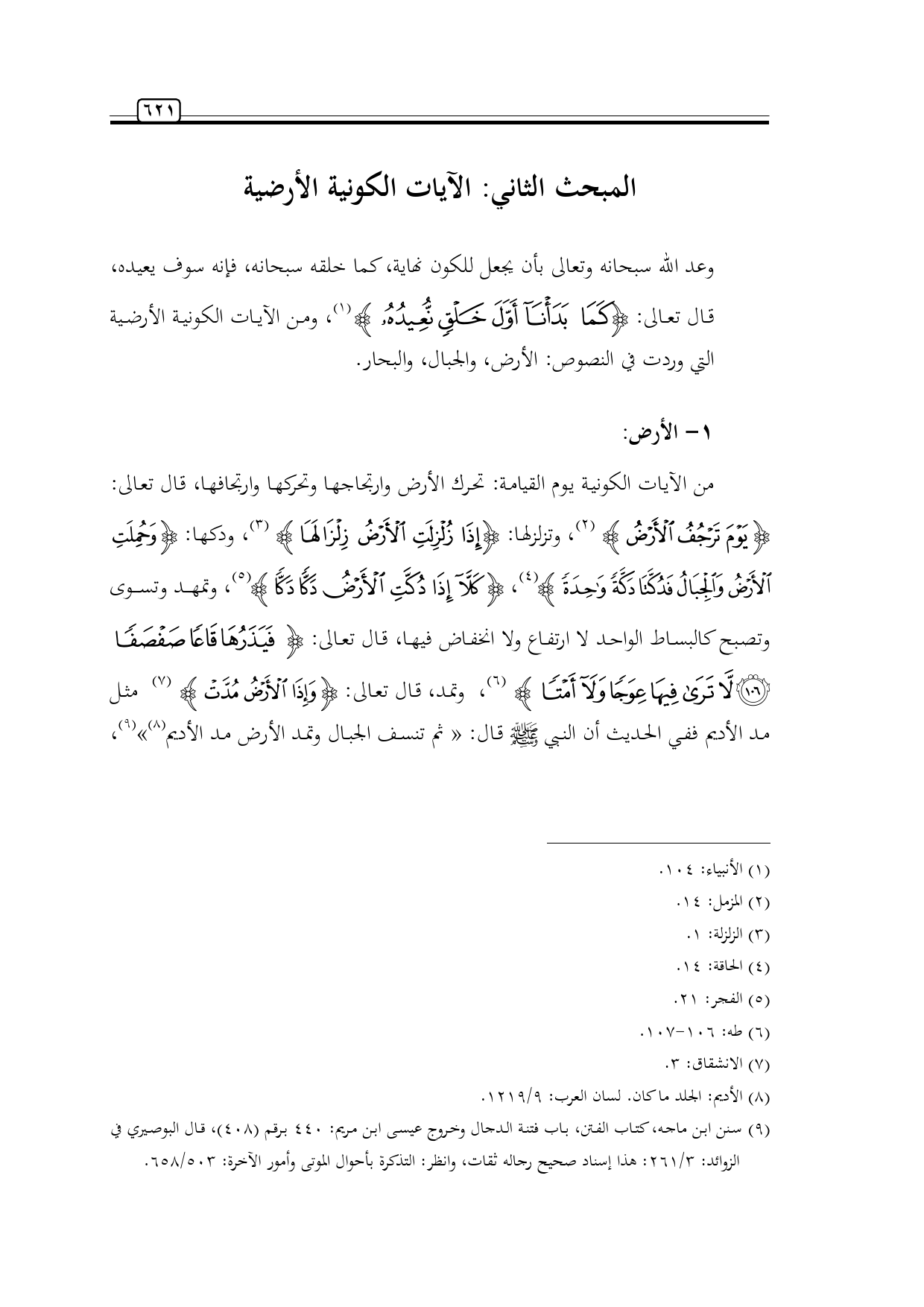 وعد الله سبحانه وتعالى بأن يجعل للكون نهاية، كما خلقه سبحانه، فإنه سوف يعيده، قال تعالى: {كَمَا بَدَأْنَا أَوَّلَ خَلْقٍ نُعِيدُهُ} (¬1)، ومن الآيات الكونية الأرضية التي وردت في النصوص: الأرض، والجبال، والبحار.