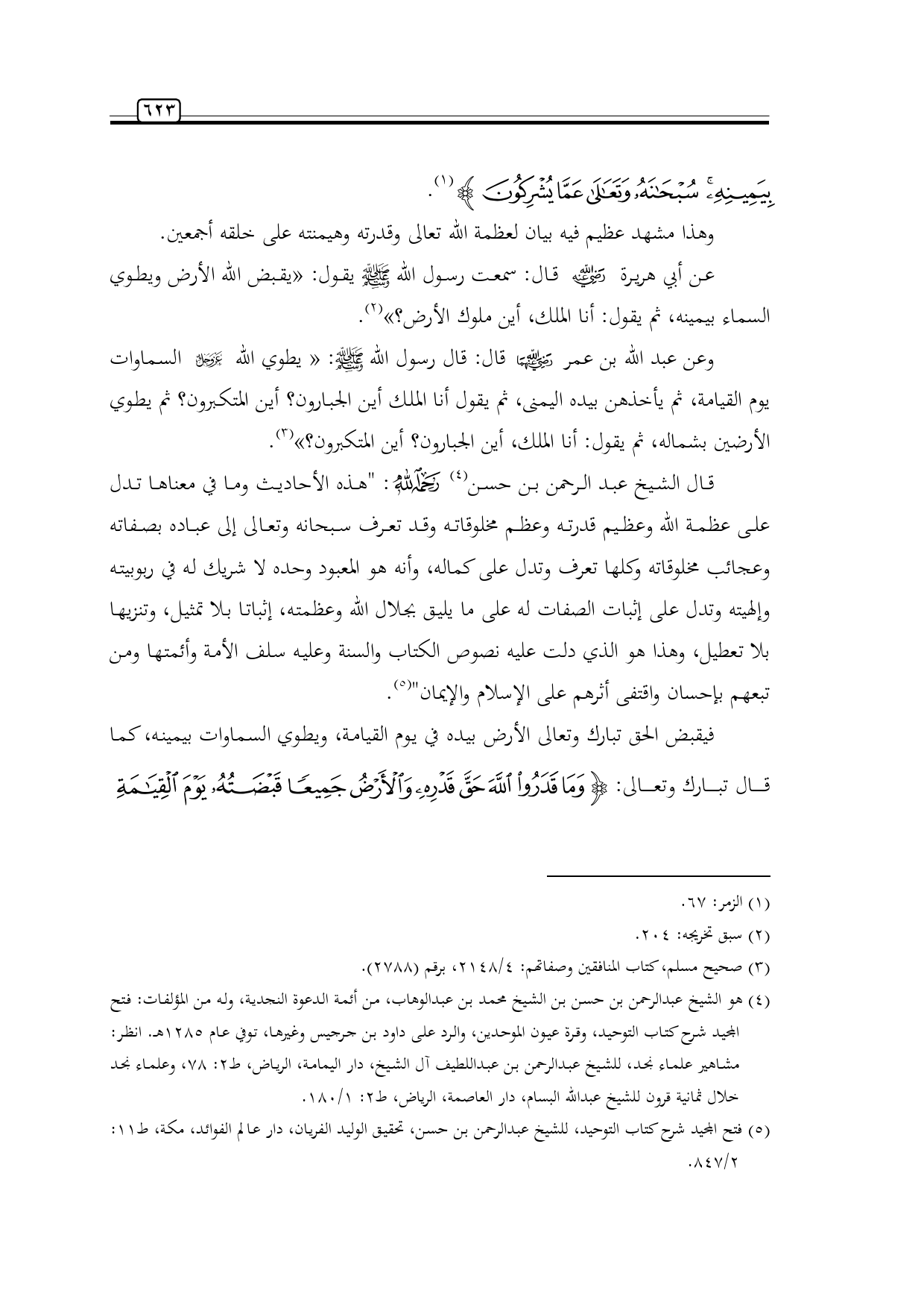 بِيَمِينِهِ سُبْحَانَهُ وَتَعَالَى عَمَّا يُشْرِكُونَ (¬1).