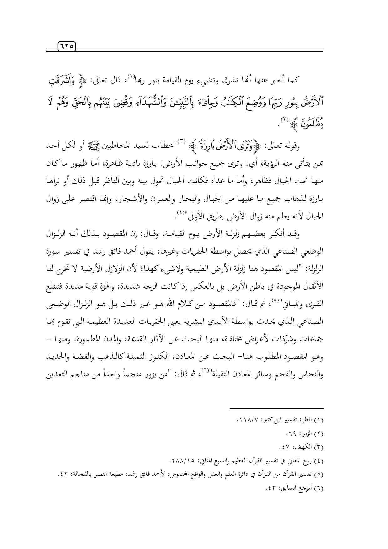 وقد أنكر بعضهم زلزلة الأرض يوم القيامة، وقال: إن المقصود بذلك أنه الزلزال الوضعي الصناعي الذي يحصل بواسطة الحفريات وغيرها، يقول أحمد فائق رشد في تفسير سورة الزلزلة: "ليس المقصود هنا زلزلة الأرض الطبيعية ولاشيء كهذا؛ لأن الزلازل الأرضية لا تخرج لنا الأثقال الموجودة في باطن الأرض بل بالعكس إذا كانت الرجة شديدة، والهزة قوية مديدة فتبتلع القرى والمباني" (¬5)، ثم قال: "فالمقصود من كلام الله هو غير ذلك بل هو الزلزال الوضعي الصناعي الذي يحدث بواسطة الأيدي البشرية يعني الحفريات العديدة العظيمة التي تقوم بها جماعات وشركات لأغراض مختلفة، منها البحث عن الآثار القديمة، والمدن المطمورة. ومنها -وهو المقصود المطلوب هنا- البحث عن المعادن، الكنوز الثمينة كالذهب والفضة والحديد والنحاس والفحم وسائر المعادن الثقيلة" (¬6)، ثم قال: "من يزور منجماً واحداً من مناجم التعدين