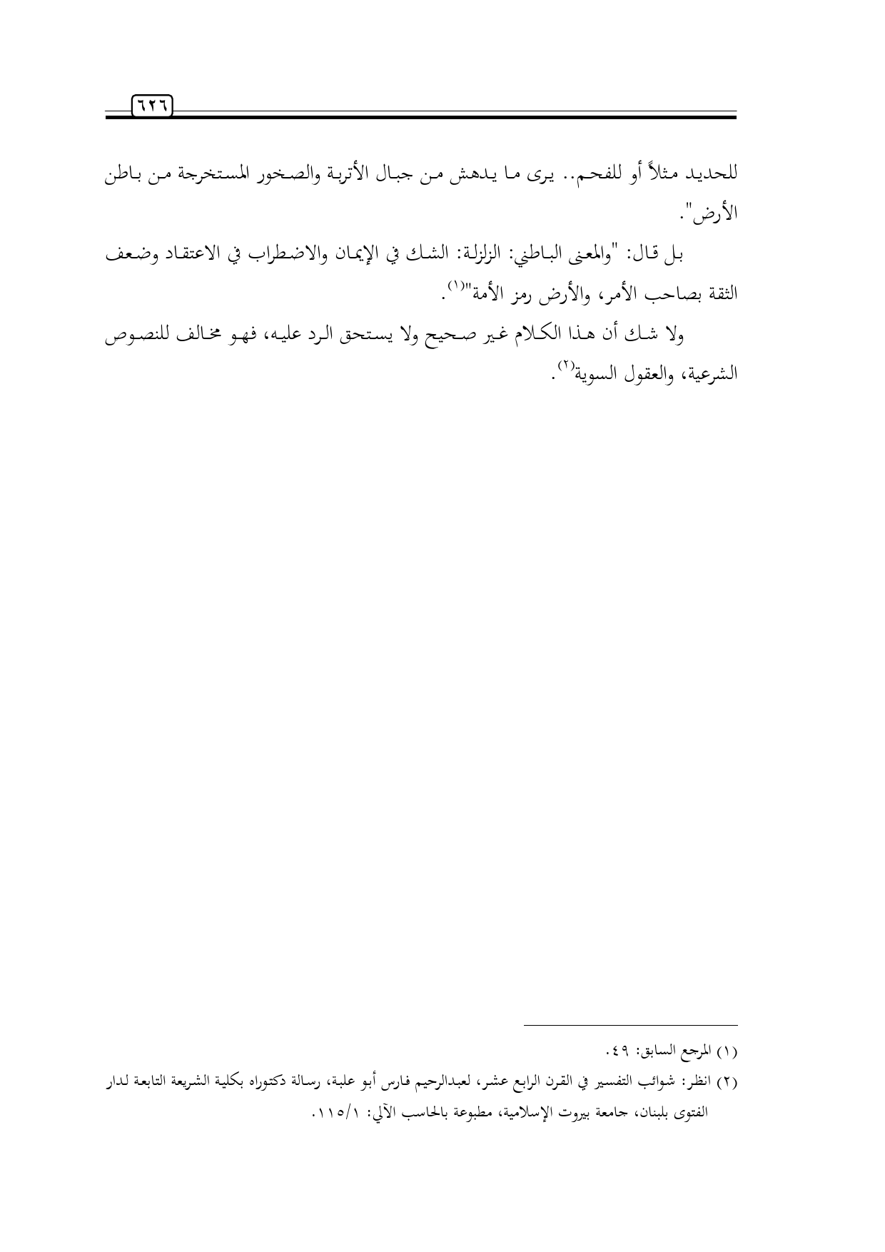 بل قال: "والمعنى الباطني: الزلزلة: الشك في الإيمان والاضطراب في الاعتقاد وضعف الثقة بصاحب الأمر، والأرض رمز الأمة" (¬1).