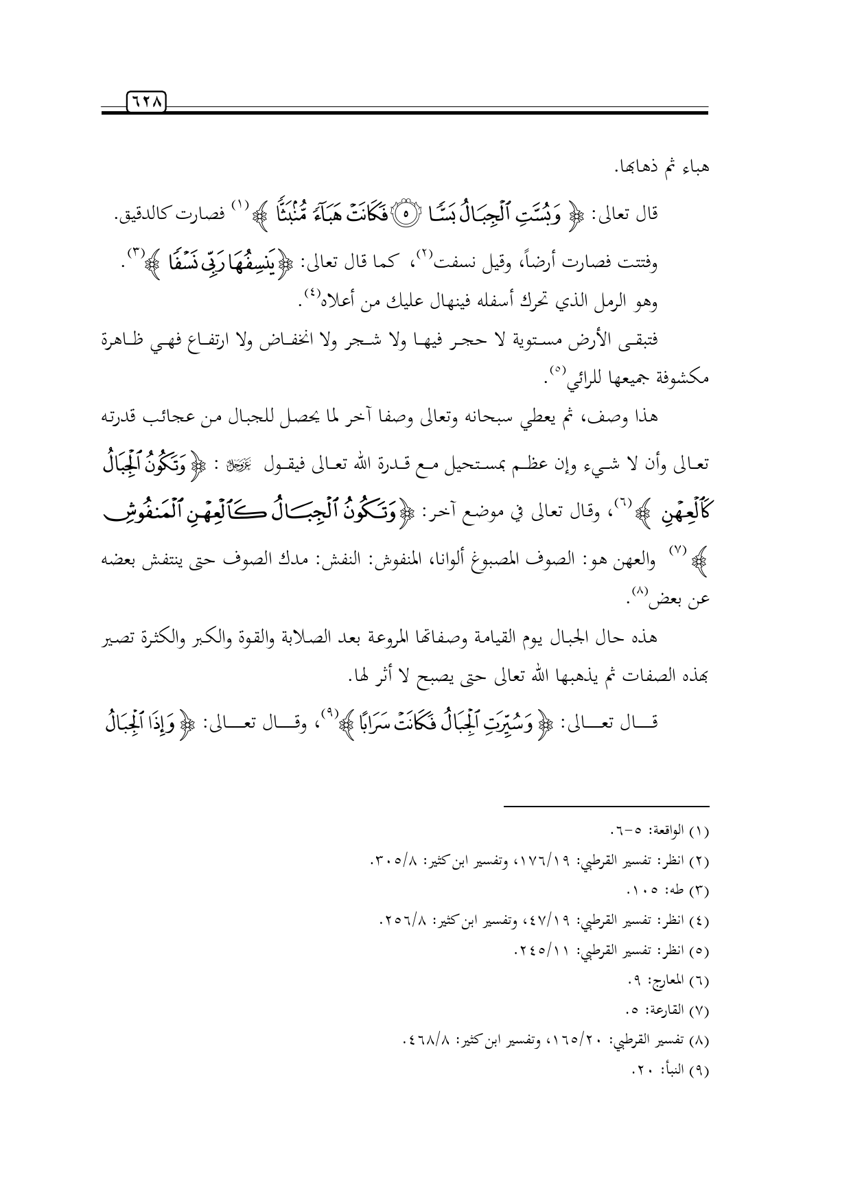 هذا وصف، ثم يعطي سبحانه وتعالى وصفا آخر لما يحصل للجبال من عجائب قدرته تعالى وأن لا شيء وإن عظم بمستحيل مع قدرة الله تعالى فيقول -عز وجل-: {وَتَكُونُ الْجِبَالُ كَالْعِهْنِ} (¬6)، وقال تعالى في موضع آخر: {وَتَكُونُ الْجِبَالُ كَالْعِهْنِ الْمَنْفُوشِ} (¬7) والعهن هو: الصوف المصبوغ ألوانا، المنفوش: النفش: مدك الصوف حتى ينتفش بعضه عن بعض (¬8).
