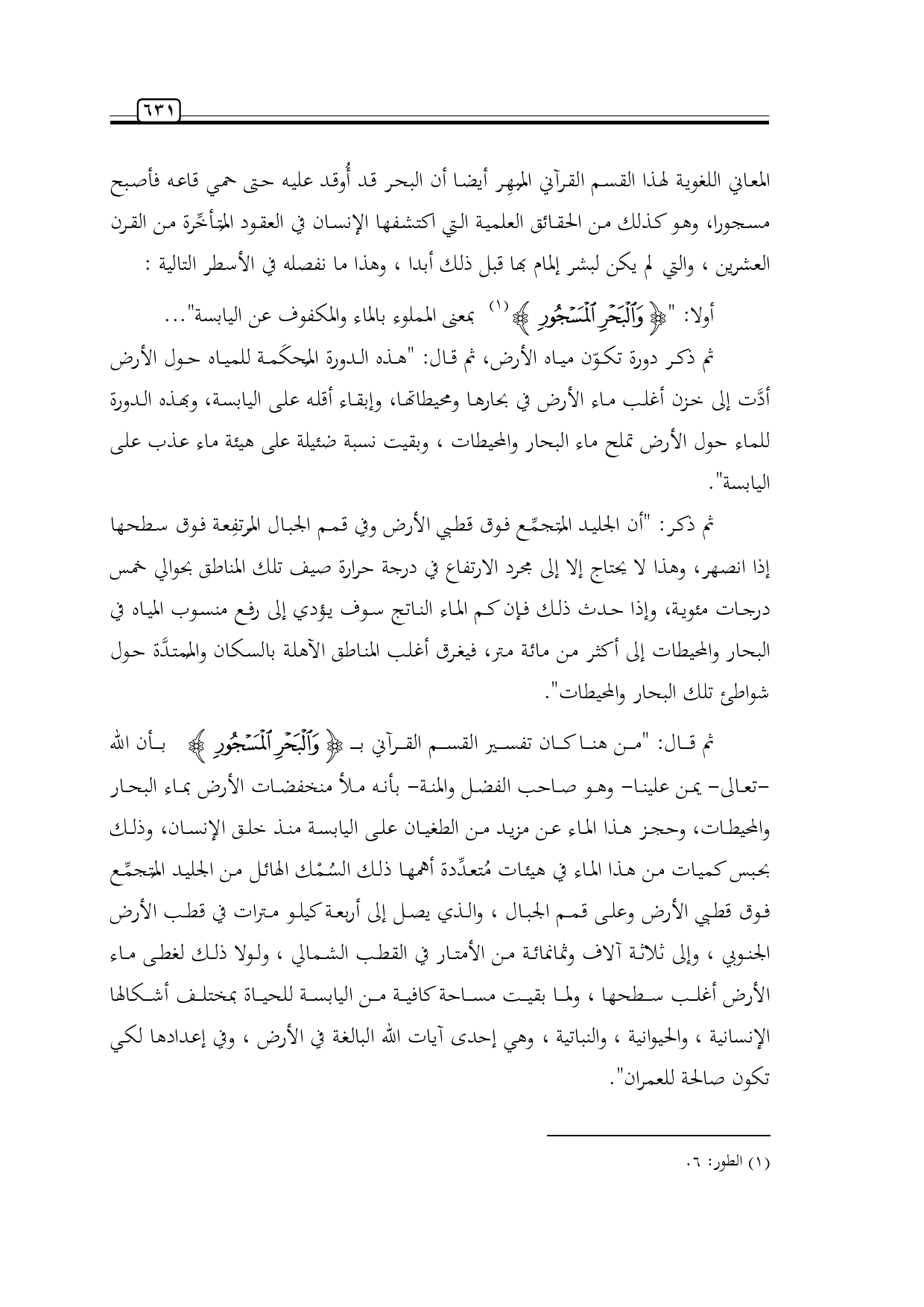 ثم قال: "من هنا كان تفسير القسم القرآني بـ {وَالْبَحْرِ الْمَسْجُورِ} بأن الله -تعالى- يمن علينا- وهو صاحب الفضل والمنة- بأنه ملأ منخفضات الأرض بماء البحار والمحيطات , وحجز هذا الماء عن مزيد من الطغيان على اليابسة منذ خلق الإنسان , وذلك بحبس كميات من هذا الماء في هيئات مُتعدِّدة أهمها ذلك السُمْك الهائل من الجليد المُتجمِّع فوق قطبي الأرض وعلى قمم الجبال , والذي يصل إلى أربعة كيلو مترات في قطب الأرض الجنوبي , وإلى ثلاثة آلاف وثمانمائة من الأمتار في القطب الشمالي , ولولا ذلك لغطى ماء الأرض أغلب سطحها , ولما بقيت مساحة كافية من اليابسة للحياة بمختلف أشكالها الإنسانية , والحيوانية , والنباتية , وهي إحدى آيات الله البالغة في الأرض , وفي إعدادها لكي تكون صالحة للعمران ".