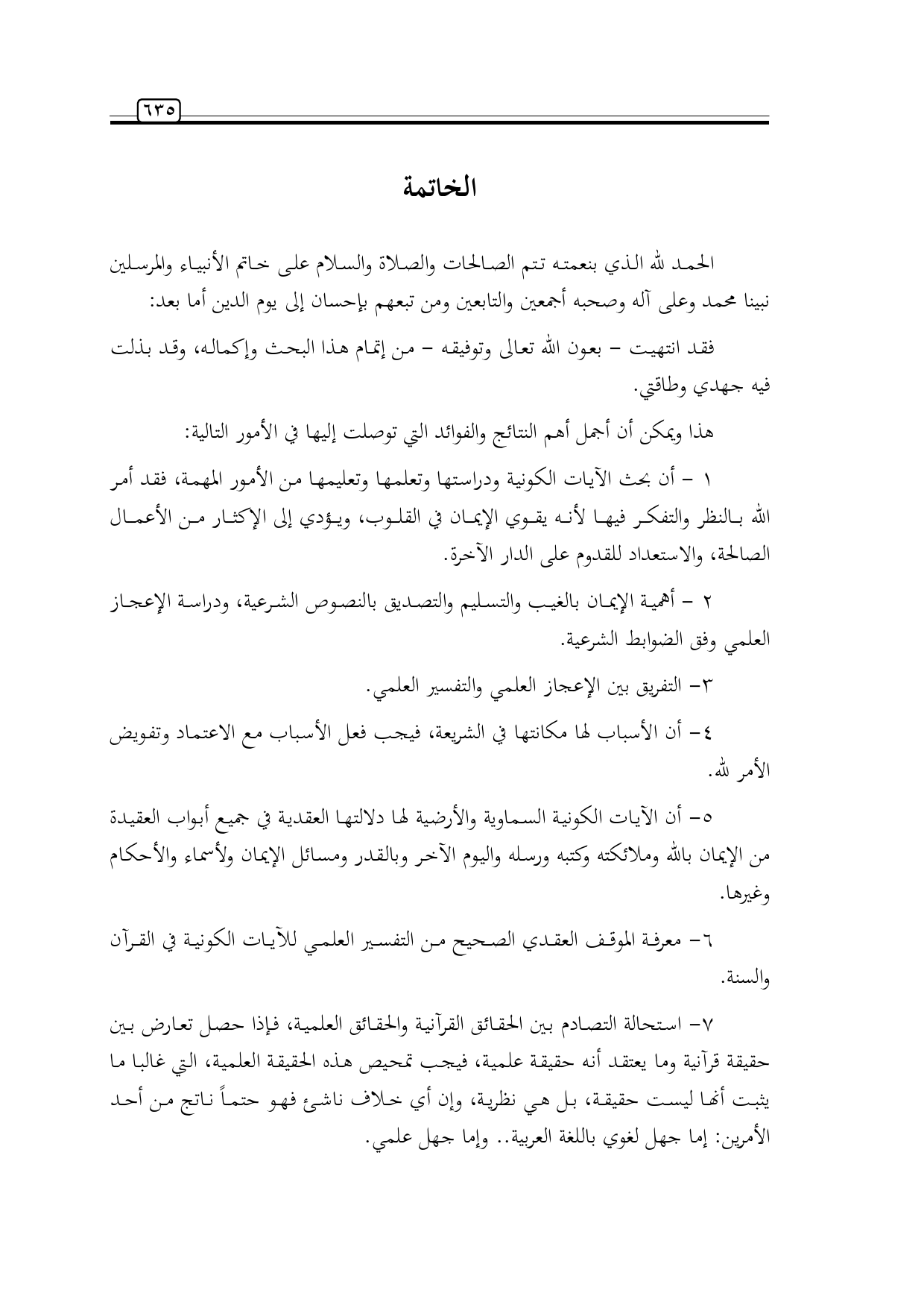 7 - استحالة التصادم بين الحقائق القرآنية والحقائق العلمية، فإذا حصل تعارض بين حقيقة قرآنية وما يعتقد أنه حقيقة علمية، فيجب تمحيص هذه الحقيقة العلمية، التي غالبا ما يثبت أنها ليست حقيقة، بل هي نظرية، وإن أي خلاف ناشئ فهو حتماً ناتج من أحد الأمرين: إما جهل لغوي باللغة العربية .. وإما جهل علمي.