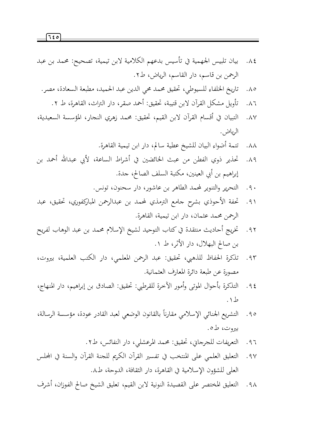 87. التبيان في أقسام القرآن لابن القيم، تحقيق: محمد زهري النجار، المؤسسة السعيدية، الرياض.