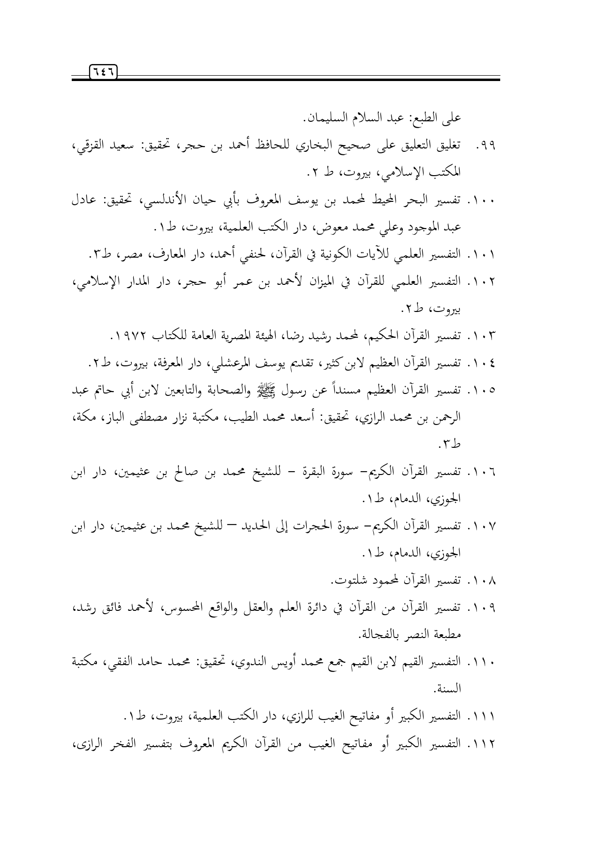 102. التفسير العلمي للقرآن في الميزان لأحمد بن عمر أبو حجر، دار المدار الإسلامي، بيروت، ط2.