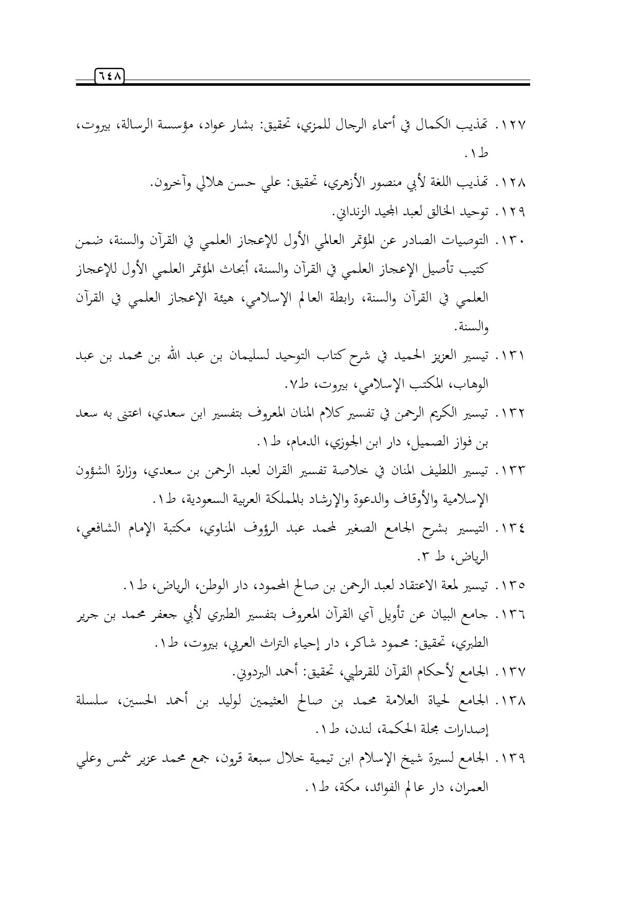 132. تيسير الكريم الرحمن في تفسير كلام المنان المعروف بتفسير ابن سعدي، اعتنى به سعد بن فواز الصميل، دار ابن الجوزي، الدمام، ط1.