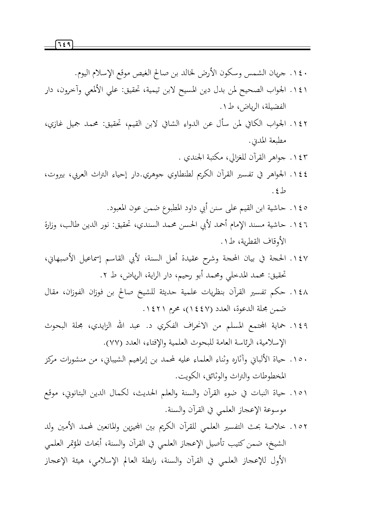 148. حكم تفسير القرآن بنظريات علمية حديثة للشيخ صالح بن فوزان الفوزان، مقال ضمن مجلة الدعوة، العدد (1447)، محرم 1421.