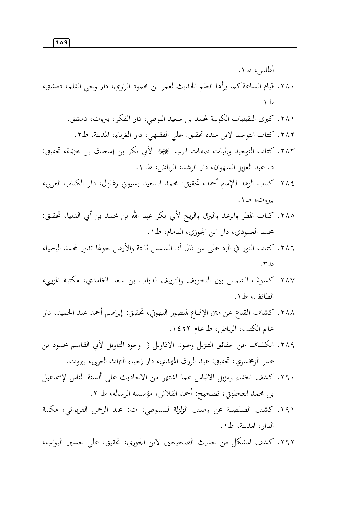 291. كشف الصلصلة عن وصف الزلزلة للسيوطي، ت: عبد الرحمن الفريوائي، مكتبة الدار، المدينة، ط1.