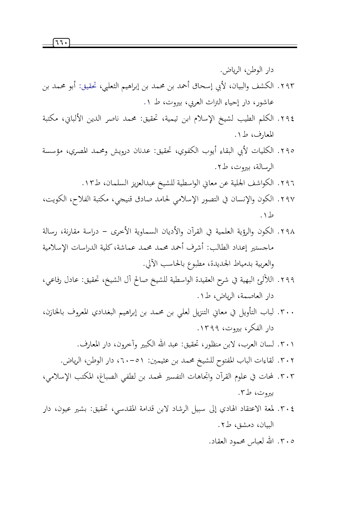 298. الكون والرؤية العلمية في القرآن والأديان السماوية الأخرى - دراسة مقارنة، رسالة ماجستير إعداد الطالب: أشرف أحمد محمد محمد عماشة، كلية الدراسات الإسلامية والعربية بدمياط الجديدة، مطبوع بالحاسب الآلي.