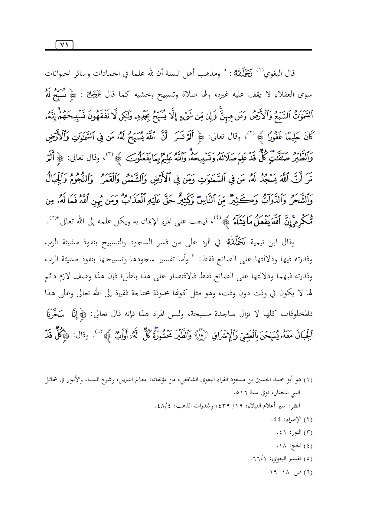 قال البغوي (¬1) -رحمه الله-: " ومذهب أهل السنة أن لله علما في الجمادات وسائر الحيوانات سوى العقلاء لا يقف عليه غيره، ولها صلاة وتسبيح وخشية كما قال -عز وجل-: {تُسَبِّحُ لَهُ السَّمَاوَاتُ السَّبْعُ وَالْأَرْضُ وَمَنْ فِيهِنَّ وَإِنْ مِنْ شَيْءٍ إِلَّا يُسَبِّحُ بِحَمْدِهِ وَلَكِنْ لَا تَفْقَهُونَ تَسْبِيحَهُمْ إِنَّهُ كَانَ حَلِيمًا غَفُورًا} (¬2)، وقال تعالى: {أَلَمْ تَرَ أَنَّ اللَّهَ يُسَبِّحُ لَهُ مَنْ فِي السَّمَاوَاتِ وَالْأَرْضِ وَالطَّيْرُ صَافَّاتٍ كُلٌّ قَدْ عَلِمَ صَلَاتَهُ وَتَسْبِيحَهُ وَاللَّهُ عَلِيمٌ بِمَا يَفْعَلُونَ} (¬3)، وقال تعالى: {أَلَمْ تَرَ أَنَّ اللَّهَ يَسْجُدُ لَهُ مَنْ فِي السَّمَاوَاتِ وَمَنْ فِي الْأَرْضِ وَالشَّمْسُ وَالْقَمَرُ وَالنُّجُومُ وَالْجِبَالُ وَالشَّجَرُ وَالدَّوَابُّ وَكَثِيرٌ مِنَ النَّاسِ وَكَثِيرٌ حَقَّ عَلَيْهِ الْعَذَابُ وَمَنْ يُهِنِ اللَّهُ فَمَا لَهُ مِنْ مُكْرِمٍ إِنَّ اللَّهَ يَفْعَلُ مَا يَشَاءُ} (¬4)، فيجب على المرء الإيمان به ويكل علمه إلى الله تعالى" (¬5).