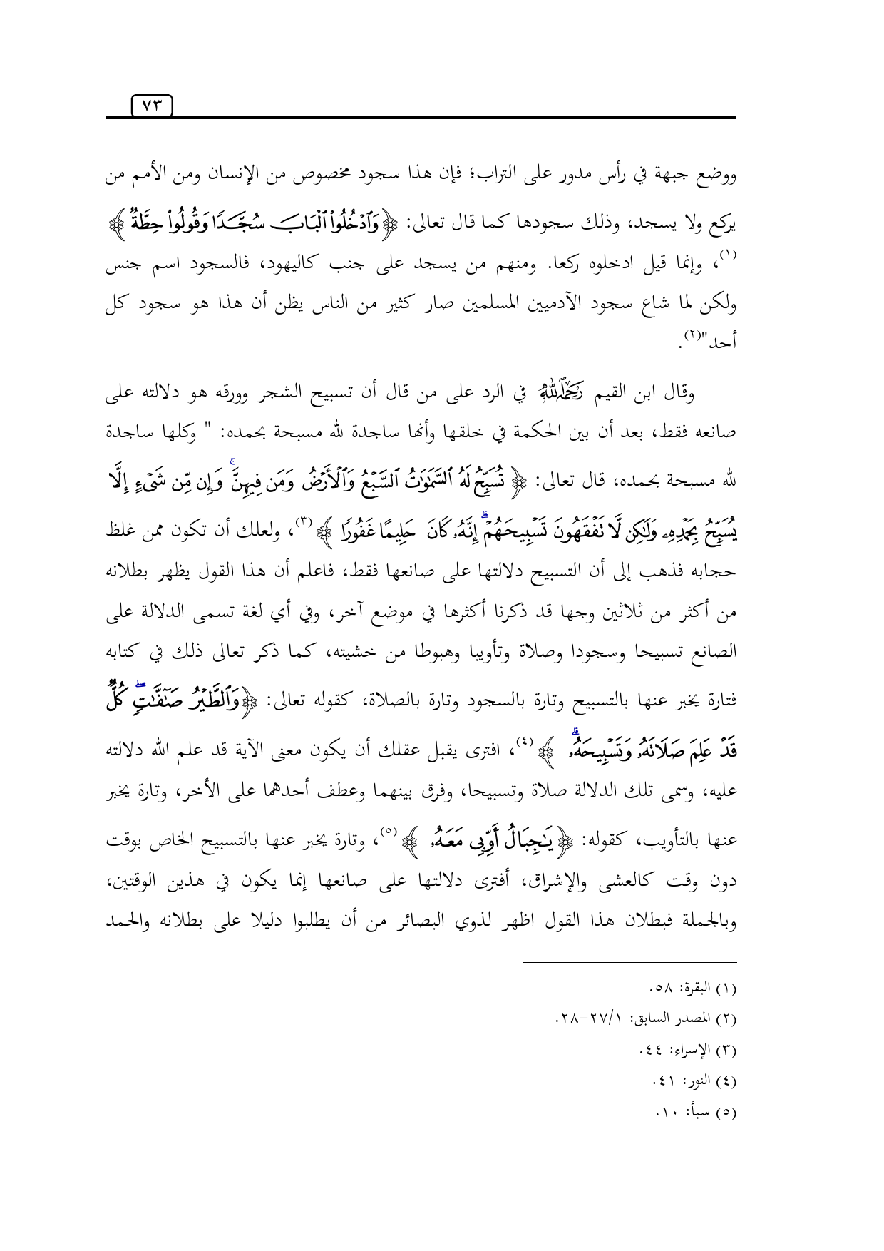 وقال ابن القيم -رحمه الله- في الرد على من قال أن تسبيح الشجر وورقه هو دلالته على صانعه فقط، بعد أن بين الحكمة في خلقها وأنها ساجدة لله مسبحة بحمده: " وكلها ساجدة لله مسبحة بحمده، قال تعالى: {تُسَبِّحُ لَهُ السَّمَاوَاتُ السَّبْعُ وَالْأَرْضُ وَمَنْ فِيهِنَّ وَإِنْ مِنْ شَيْءٍ إِلَّا يُسَبِّحُ بِحَمْدِهِ وَلَكِنْ لَا تَفْقَهُونَ تَسْبِيحَهُمْ إِنَّهُ كَانَ حَلِيمًا غَفُورًا} (¬3)، ولعلك أن تكون ممن غلظ حجابه فذهب إلى أن التسبيح دلالتها على صانعها فقط، فاعلم أن هذا القول يظهر بطلانه من أكثر من ثلاثين وجها قد ذكرنا أكثرها في موضع آخر، وفي أي لغة تسمى الدلالة على الصانع تسبيحا وسجودا وصلاة وتأويبا وهبوطا من خشيته، كما ذكر تعالى ذلك في كتابه فتارة يخبر عنها بالتسبيح وتارة بالسجود وتارة بالصلاة، كقوله تعالى: {وَالطَّيْرُ صَافَّاتٍ كُلٌّ قَدْ عَلِمَ صَلَاتَهُ وَتَسْبِيحَهُ} (¬4)، افترى يقبل عقلك أن يكون معنى الآية قد علم الله دلالته عليه، وسمى تلك الدلالة صلاة وتسبيحا، وفرق بينهما وعطف أحدهما على الأخر، وتارة يخبر عنها بالتأويب، كقوله: {يَاجِبَالُ أَوِّبِي مَعَهُ} (¬5)، وتارة يخبر عنها بالتسبيح الخاص بوقت دون وقت كالعشى والإشراق، أفترى دلالتها على صانعها إنما يكون في هذين الوقتين، وبالجملة فبطلان هذا القول اظهر لذوي البصائر من أن يطلبوا دليلا على بطلانه والحمد لله" (¬6).