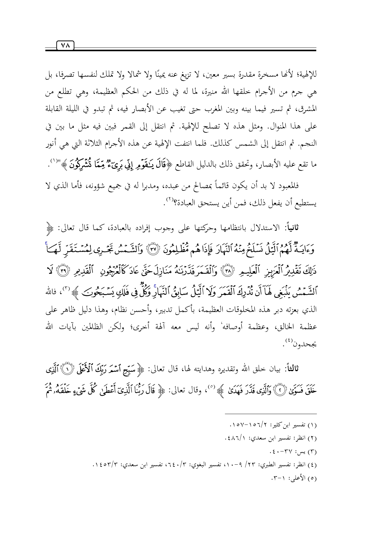ثانياً: الاستدلال بانتظامها وحركتها على وجوب إفراده بالعبادة، كما قال تعالى: {وَآيَةٌ لَهُمُ اللَّيْلُ نَسْلَخُ مِنْهُ النَّهَارَ فَإِذَا هُمْ مُظْلِمُونَ (37) وَالشَّمْسُ تَجْرِي لِمُسْتَقَرٍّ لَهَا ذَلِكَ تَقْدِيرُ الْعَزِيزِ الْعَلِيمِ (38) وَالْقَمَرَ قَدَّرْنَاهُ مَنَازِلَ حَتَّى عَادَ كَالْعُرْجُونِ الْقَدِيمِ (39) لَا الشَّمْسُ يَنْبَغِي لَهَا أَنْ تُدْرِكَ الْقَمَرَ وَلَا اللَّيْلُ سَابِقُ النَّهَارِ وَكُلٌّ فِي فَلَكٍ يَسْبَحُونَ} (¬3)، فالله الذي بعزته دبر هذه المخلوقات العظيمة، بأكمل تدبير، وأحسن نظام، وهذا دليل ظاهر على عظمة الخالق، وعظمة أوصافه، وأنه ليس معه آلهة أخرى؛ ولكن الظالمين بآيات الله يجحدون (¬4).