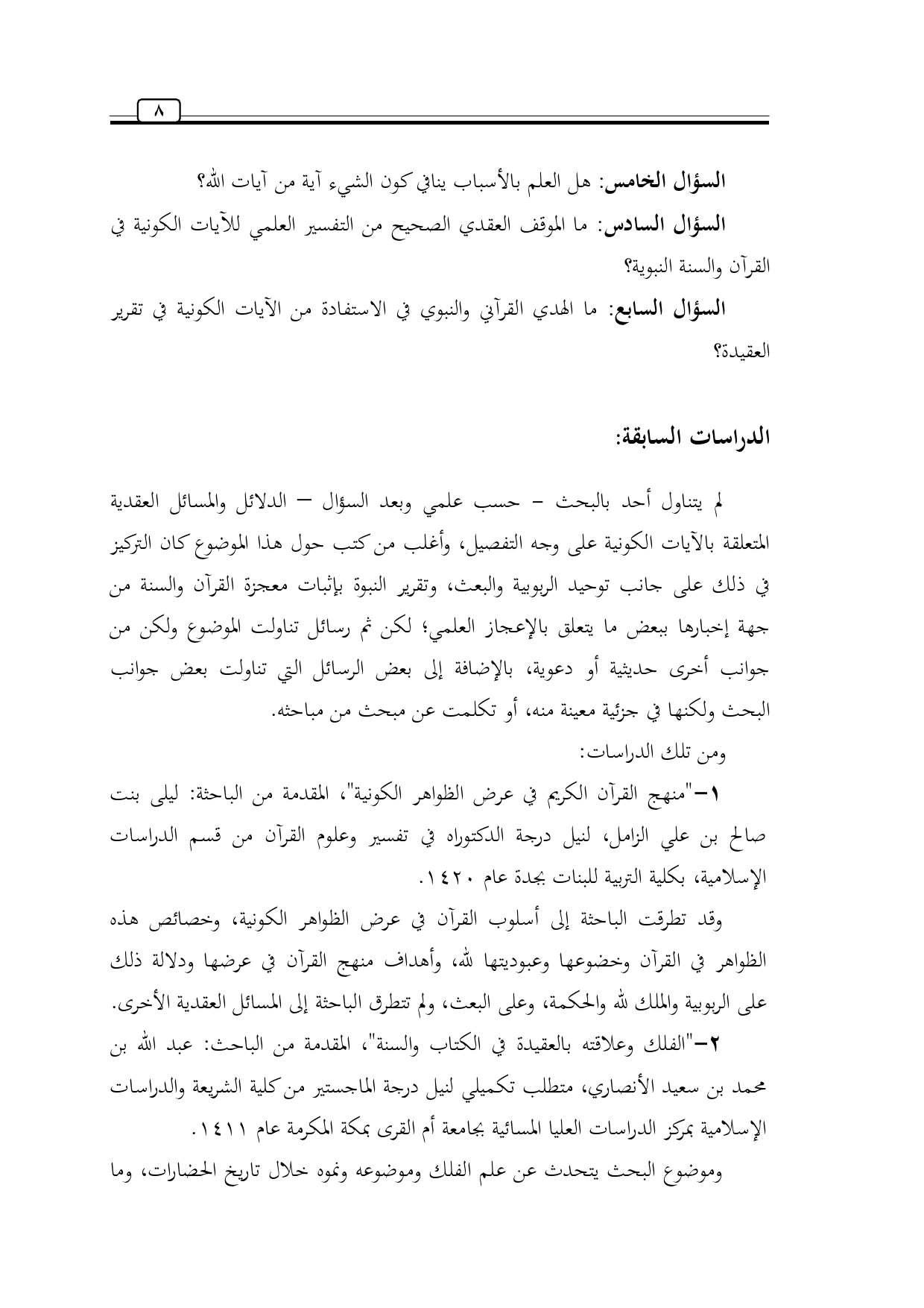 1 - "منهج القرآن الكريم في عرض الظواهر الكونية"، المقدمة من الباحثة: ليلى بنت صالح بن علي الزامل، لنيل درجة الدكتوراه في تفسير وعلوم القرآن من قسم الدراسات الإسلامية، بكلية التربية للبنات بجدة عام 1420.
