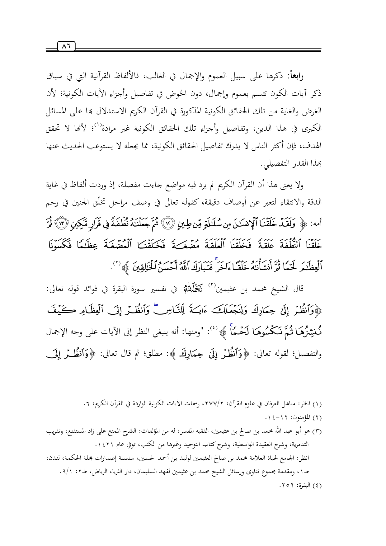 قال الشيخ محمد بن عثيمين (¬3) -رحمه الله- في تفسير سورة البقرة في فوائد قوله تعالى: {وَانْظُرْ إِلَى حِمَارِكَ وَلِنَجْعَلَكَ آيَةً لِلنَّاسِ وَانْظُرْ إِلَى الْعِظَامِ كَيْفَ نُنْشِزُهَا ثُمَّ نَكْسُوهَا لَحْمًا} (¬4): "ومنها: أنه ينبغي النظر إلى الآيات على وجه الإجمال والتفصيل؛ لقوله تعالى: {وَانْظُرْ إِلَى حِمَارِكَ}: مطلق؛ ثم قال تعالى: {وَانْظُرْ إِلَى
