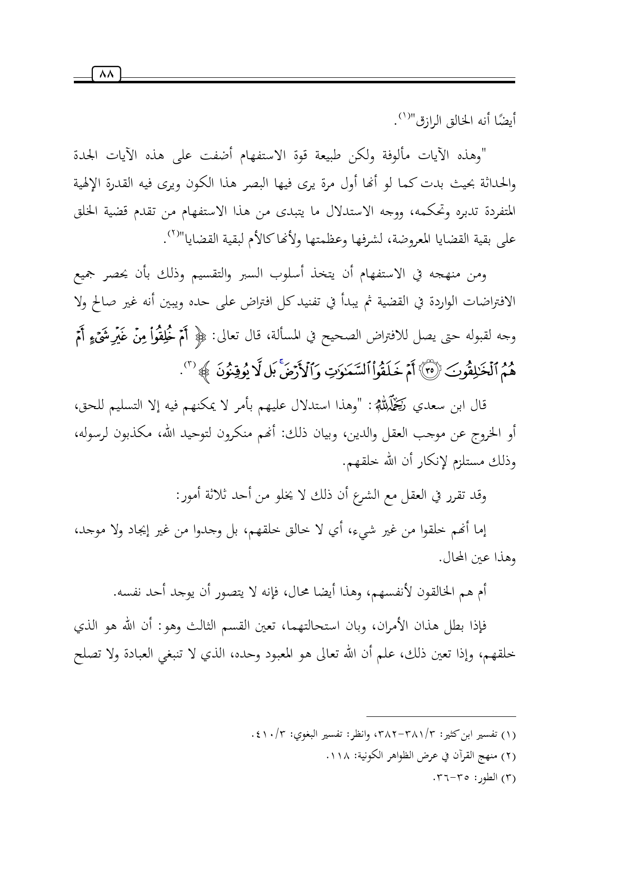 ومن منهجه في الاستفهام أن يتخذ أسلوب السبر والتقسيم وذلك بأن يحصر جميع الافتراضات الواردة في القضية ثم يبدأ في تفنيد كل افتراض على حده ويبين أنه غير صالح ولا وجه لقبوله حتى يصل للافتراض الصحيح في المسألة، قال تعالى: {أَمْ خُلِقُوا مِنْ غَيْرِ شَيْءٍ أَمْ هُمُ الْخَالِقُونَ (35) أَمْ خَلَقُوا السَّمَاوَاتِ وَالْأَرْضَ بَلْ لَا يُوقِنُونَ} (¬3).