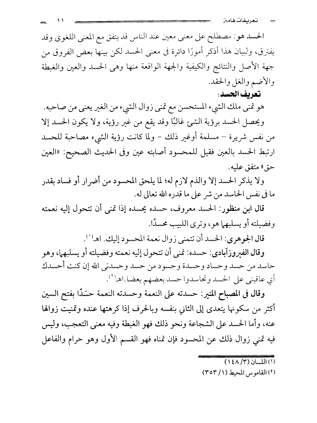 وقال الفيروزآبادى: حسده تمنى أن تتحول إليه نعمته وفضيلته أو يسلبهما وهو حاسد من حسد وحساد وحسدة وحسود من حسد وحسدنى الله إن كنت أحسدك أي عاقبنى على الحسد وتحاسدوا حسد بعضهم بعضا. اهـ (¬2)