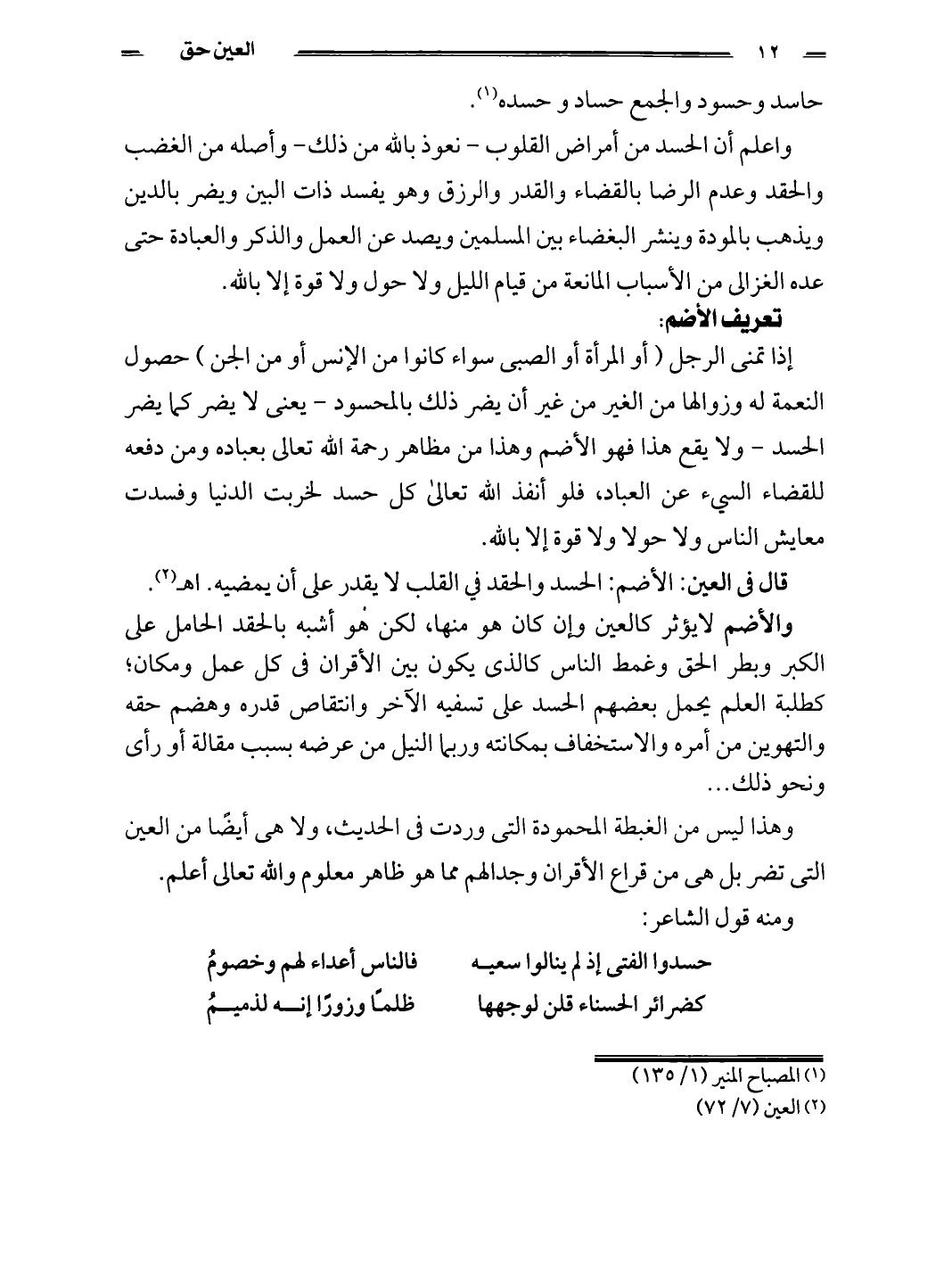 والأضم لايؤثر كالعين وإن كان هو منها لكن هو أشبه بالحقد الحامل على الكبر وبطر الحق وغمط الناس كالذى يكون بين الأقران فى كل عمل ومكان كطلبة العلم يحمل بعضهم الحسد على تسفيه الآخر وانتقاص قدره وهضم حقه والتهوين من أمره والإستخفاف بمكانته وربما النيل من عرضه بسسبب مقالة أو رأى ونحو ذلك وهذا ليس من الغبطة المحمودة التى وردت فى الحديث ولا هى أيضا من العين التى تضر بل هى من قراع الأقران وجدالهم مما هو ظاهر معلوم والله تعالى أعلم. ومنه قول الشاعر: