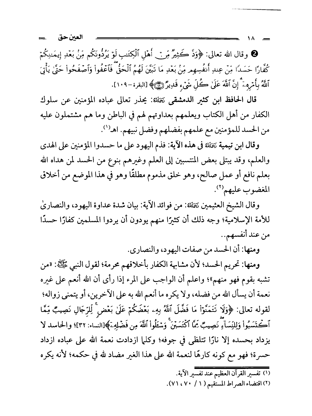 وقال الشيخ العثيمين رحمه الله: من فوائد الآية: بيان شدة عداوة اليهود، والنصارى للأمة الإسلامية؛ وجه ذلك أن كثيراً منهم يودون أن يردوا المسلمين كفاراً حسداً من عند أنفسهم ..