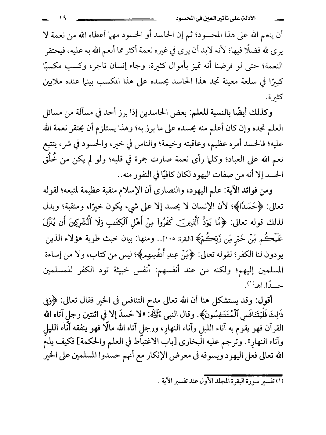 أقول: وقد يستشكل هنا أن الله تعالى مدح التنافس فى الخير فقال تعالى {وَفِي ذَلِكَ فَلْيَتَنَافَسِ الْمُتَنَافِسُونَ}. وقال النبى صلى الله عليه وسلم " لا حَسدَ إلا في اثنتين رجلٍ آتاه الله القرآن فهو يقوم به آناء الليلِ وآناء النهارِ ورجلٍ آتاه الله مالاً فهن ينفقه آناء الليلِ وآناء النهارِ ". وترجم عليه البخارى " باب الاغتباط في العلم والحكمة " فكيف يذم الله تعالى فعل اليهود ويسوقه فى معرض الإنكار مع أنهم حسدوا المسلمين على الخير
