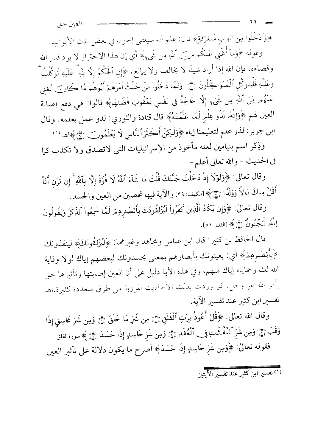 * ... وقال الله تعالى: {قُلْ أَعُوذُ بِرَبِّ الفَلَقِ. مِن شَرِّ مَا خَلَقَ. وَمِن شَرِّ غَاسِقٍ إِذَا وَقَبَ. وَمِن شَرِّ النَّفَّاثَاتِ فِي العُقَدِ. وَمِن شَرِّ حَاسِدٍ إِذَا حَسَدَ} سورة الفلق (1 - 6)