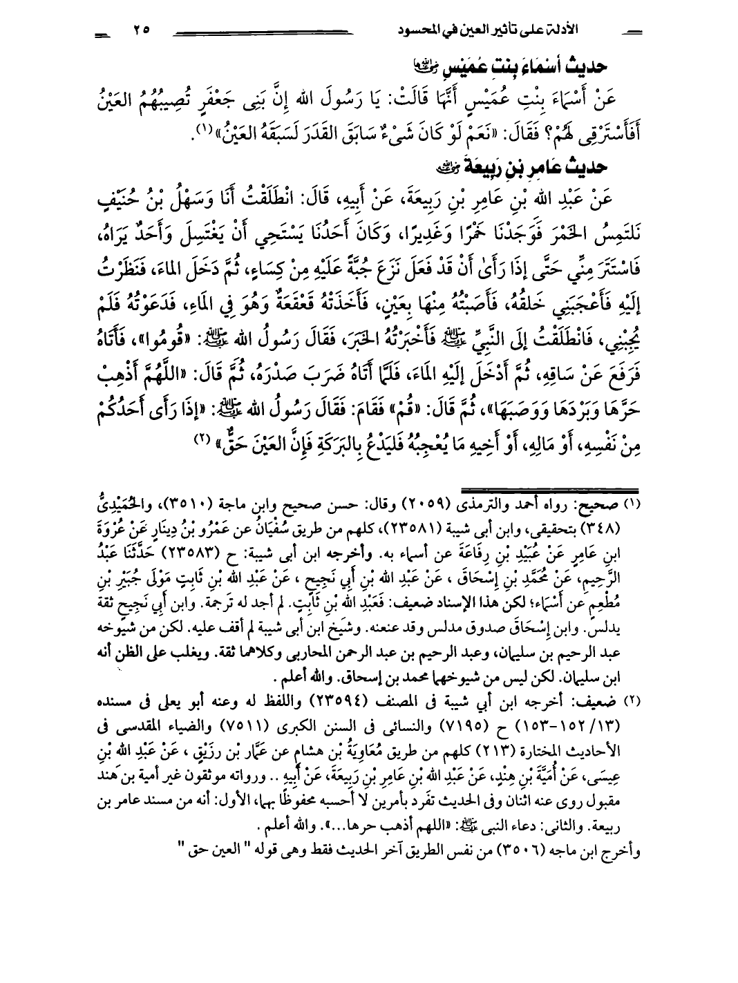 عَنْ عَبْدِ اللهِ بْنِ عَامِرِ بْنِ رَبِيعَةَ، عَنْ أَبِيهِ، قَالَ: انْطَلَقْتُ أَنَا وَسَهْلُ بْنُ حُنَيْفٍ نَلْتَمِسُ الْخَمْرَ فَوَجَدْنَا خَمْرًا وَغَدِيرًا , وَكَانَ أَحَدُنَا يَسْتَحِي أَنْ يَغْتَسِلَ وَأَحَدٌ يَرَاهُ , فَاسْتَتَرَ مِنِّي حَتَّى إذَا رَأَى أَنْ قَدْ فَعَلَ نَزَعَ جُبَّةً عَلَيْهِ مِنْ كِسَاءٍ، ثُمَّ دَخَلَ الْمَاءَ , فَنَظَرْتُ إلَيْهِ فَأَعْجَبَنِي خَلْقُهُ , فَأَصَبْتُهُ مِنْهَا بِعَيْنٍ , فَأَخَذَتْهُ قَعْقَعَةٌ وَهُوَ فِي الْمَاءِ , فَدَعَوْتُهُ فَلَمْ يُجِبْنِي , فَانْطَلَقْتُ إلَى النَّبِيِّ صلى الله عليه وسلم فَأَخْبَرْتُهُ الْخَبَرَ , فَقَالَ رَسُولُ اللهِ صلى الله عليه وسلم: قُومُوا , فَأَتَاهُ فَرَفَعَ، عَنْ سَاقِهِ، ثُمَّ أَدْخَلَ إلَيْهِ الْمَاءَ، فَلَمَّا أَتَاهُ ضَرَبَ صَدْرَهُ، ثُمَّ قَالَ: اللَّهُمَّ أَذْهِبْ حَرَّهَا وَبَرْدَهَا وَوَصَبَهَا، ثُمَّ قَالَ: قُمْ , فَقَامَ: فَقَالَ رَسُولُ اللهِ صلى الله عليه وسلم: إذَا رَأَى أَحَدُكُمْ مِنْ نَفْسِهِ، أَوْ مَالِهِ، أَوْ أَخِيهِ مَا يُعْجِبُهُ فَلْيَدْعُ بِالْبَرَكَةِ فَإِنَّ الْعَيْنَ حَقٌّ. (¬2)