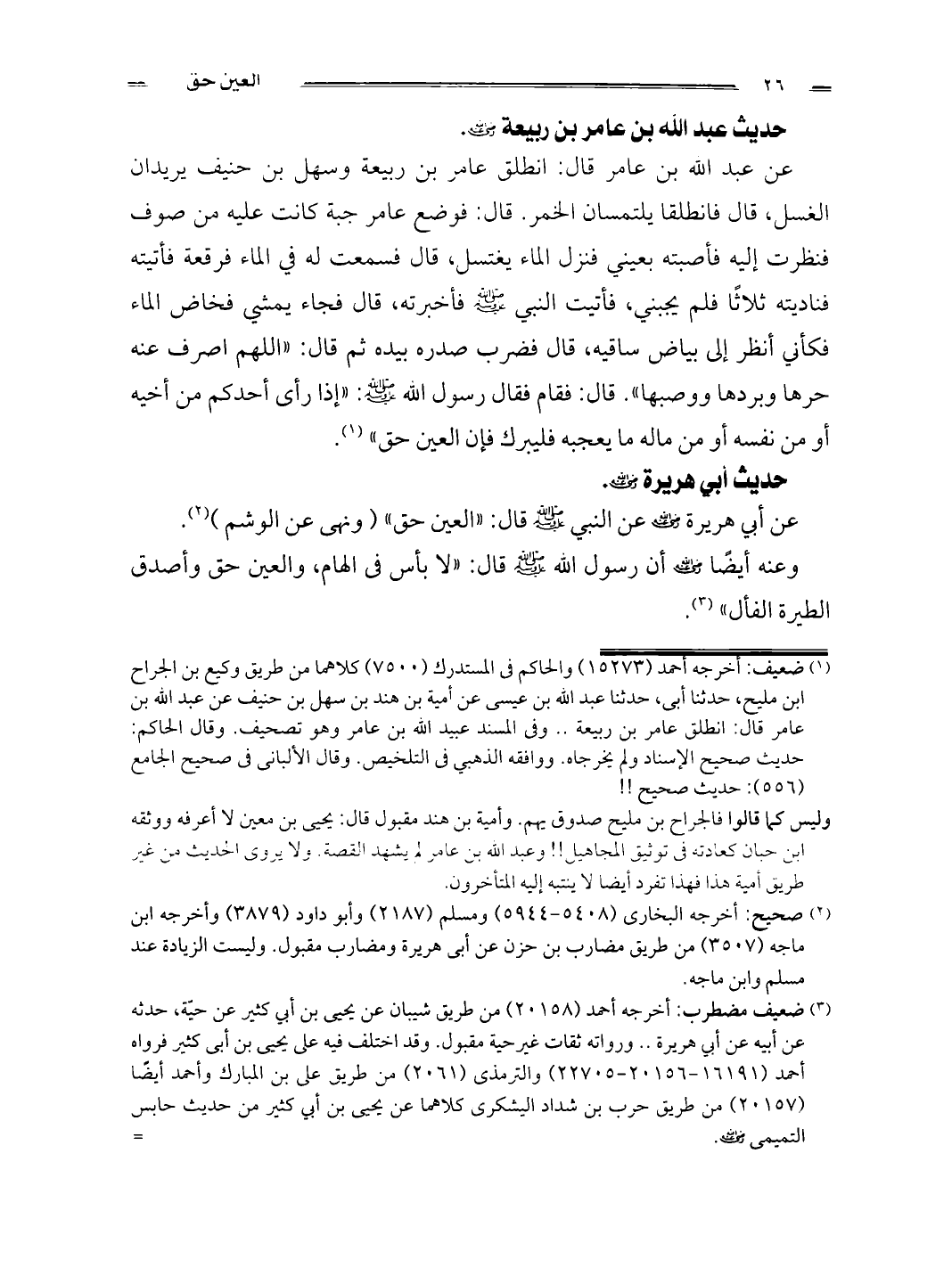 عن عبد الله بن عامر قال: انطلق عامر بن ربيعة وسهل بن حنيف يريدان الغسل, قال فانطلقا يلتمسان الخمر. قال فوضع عامر جبة كانت عليه من صوف فنظرت إليه فأصبته بعيني فنزل الماء يغتسل, قال فسمعت له في الماء فرقعة فأتيته فناديته ثلاثاً فلم يجبني, فأتيت النبي صلى الله عليه وسلم فأخبرته, قال فجاء يمشي فخاض الماء فكأني أنظر إلى بياض ساقيه, قال فضرب صدره بيده ثم قال: اللهم اصرف عنه حرها وبردها ووصبها. قال: فقام, فقال رسول الله صلى الله عليه وسلم: إذا رأى أحدكم من أخيه أو من نفسه أو من ماله ما يعجبه فليبرك فإن العين حق. (¬1)