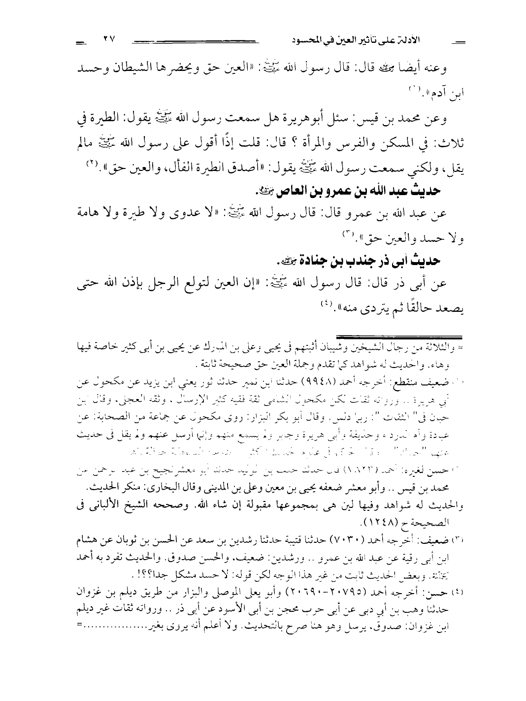عن عبد الله بن عمرو قال: قال رسول الله صلى الله عليه وسلم: لا عدوى ولا طيرة ولا هامة ولا حسد والعين حق. (¬3)