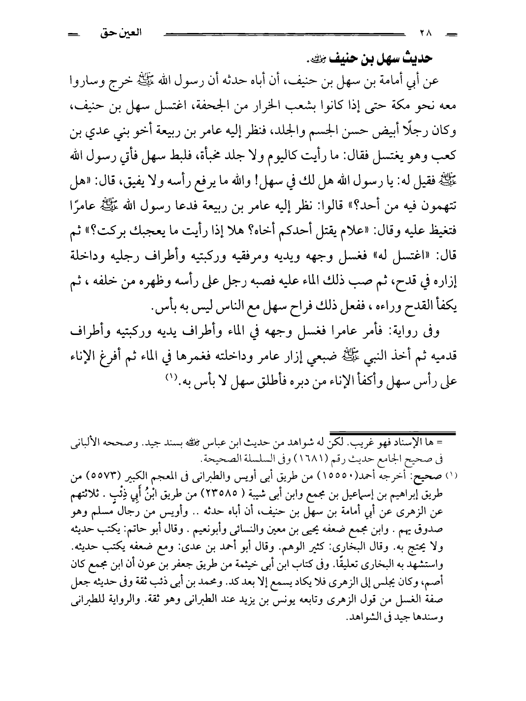 (¬1) صحيح: أخرجه أحمد (15550) من طريق أبى أويس والطبرانى فى المعجم الكبير (5573) من طريق إبراهيم بن إسماعيل بن مجمع وابن أبى شيبة (23585) من طريق ابْنُ أَبِي ذِئْبٍ. ثلاثتهم عن الزهرى عن أبي أمامة بن سهل بن حنيف, أن أباه حدثه .. وأويس من رجال مسلم وهو صدوق يهم. وابن مجمع ضعفه يحيى بن معين والنسائى وأبونعيم. وقال أبو حاتم: يكتب حديثه ولا يحتج به. وقال البخارى: كثير الوهم. وقال أبو أحمد بن عدى: ومع ضعفه يكتب حديثه. واستشهد به البخارى تعليقا. وفى كتاب ابن أبى خيثمة من طريق جعفر بن عون أن ابن مجمع كان أصم، وكان يجلس إلى الزهرى فلا يكاد يسمع إلا بعد كد. ومحمد بن أبى ذئب ثقة وفى حديثه جعل صفة الغسل من قول الزهرى وتابعه يونس بن يزيد عند الطبرانى وهو ثقة. والرواية للطبرانى وسندها جيد فى الشواهد.