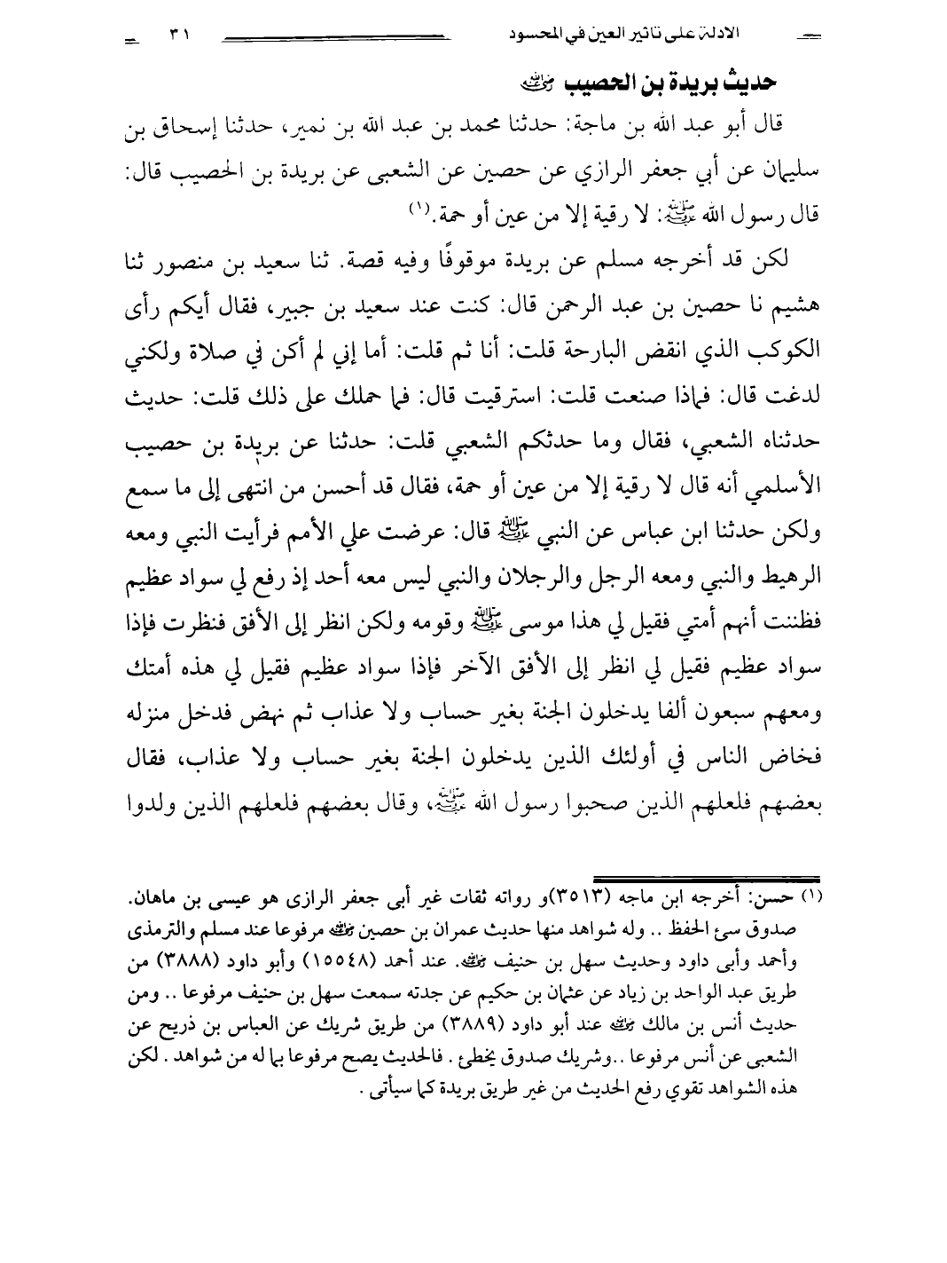 لكن قد أخرجه مسلم عن بريدة موقوفاً وفيه قصة. ثنا سعيد بن منصور ثنا هشيم نا حصين بن عبد الرحمن قال: كنت عند سعيد بن جبير، فقال أيكم رأى الكوكب الذي انقض البارحة قلت: أنا ثم قلت: أما إني لم أكن في صلاة ولكني لدغت قال: فماذا صنعت قلت: استرقيت قال: فما حملك على ذلك قلت: حديث حدثناه الشعبي، فقال وما حدثكم الشعبي قلت: حدثنا عن بريدة بن حصيب الأسلمي أنه قال لا رقية إلا من عين أو حمة، فقال قد أحسن من انتهى إلى ما سمع ولكن حدثنا ابن عباس عن النبي صلى الله عليه وسلم قال: عرضت علي الأمم فرأيت النبي ومعه الرهيط والنبي ومعه الرجل والرجلان والنبي ليس معه أحد إذ رفع لي سواد عظيم فظننت أنهم أمتي فقيل لي هذا موسى صلى الله عليه وسلم وقومه ولكن انظر إلى الأفق فنظرت فإذا سواد عظيم فقيل لي انظر إلى الأفق الآخر فإذا سواد عظيم فقيل لي هذه أمتك ومعهم سبعون ألفا يدخلون الجنة بغير حساب ولا عذاب ثم نهض فدخل منزله فخاض الناس في أولئك الذين يدخلون الجنة بغير حساب ولا عذاب، فقال بعضهم فلعلهم الذين صحبوا رسول الله صلى الله عليه وسلم، وقال بعضهم فلعلهم الذين ولدوا