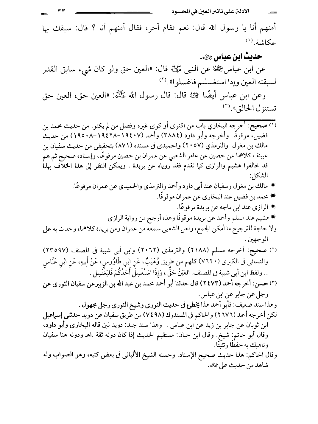عن ابن عباس رضى الله عنهما عن النبى صلى الله عليه وسلم قال: العين حق ولو كان شيء سابق القدر لسبقته العين وإذا استغسلتم فاغسلوا. (¬2)