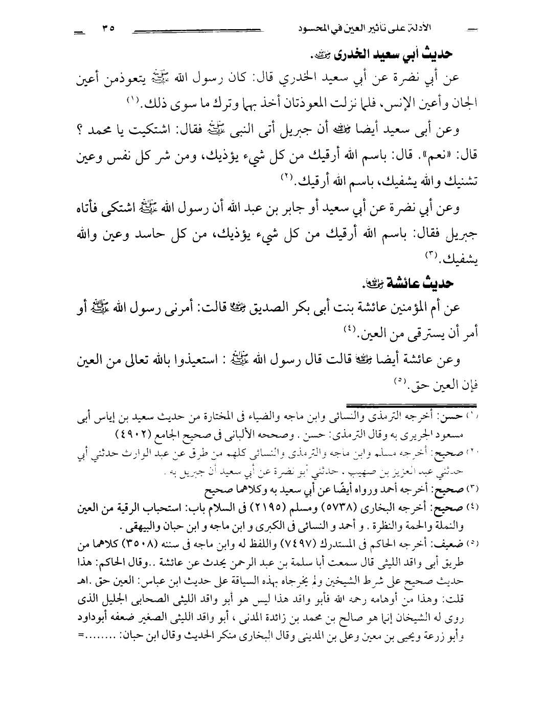 عن أبي نضرة عن أبي سعيد الخدري قال: كان رسول الله صلى الله عليه وسلم يتعوذمن أعين الجان وأعين الإنس, فلما نزلت المعوذتان أخذ بهما وترك ما سوى ذلك. (¬1)