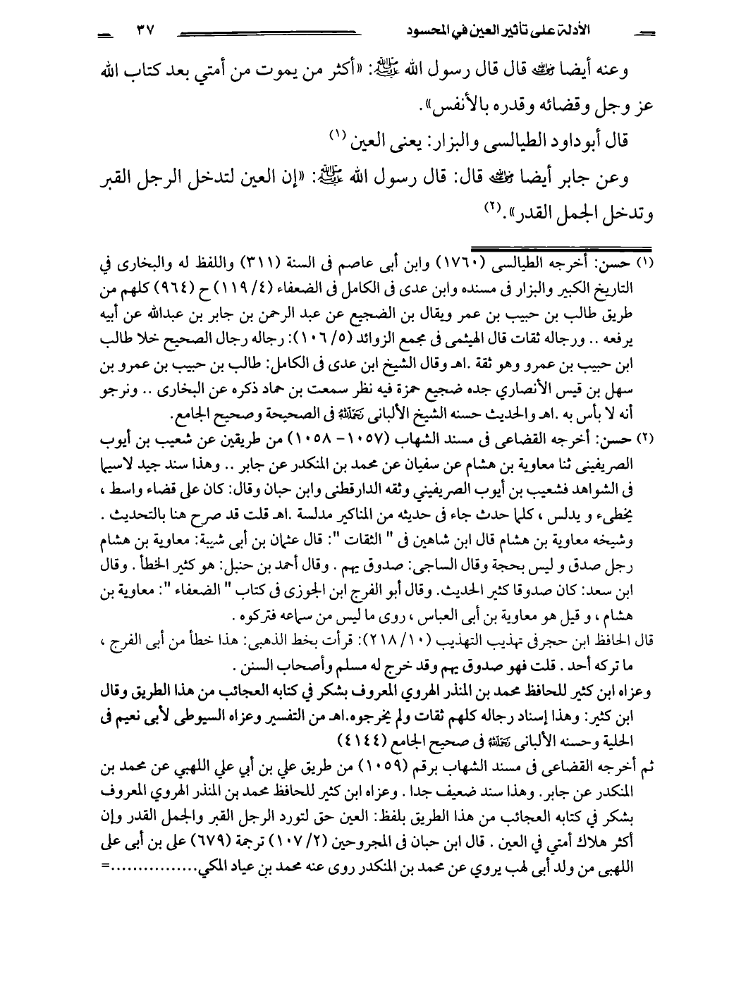 وعن جابر أيضا رضى الله عنه قال قال رسول الله صلى الله عليه وسلم ثم إن العين لتدخل الرجل القبر وتدخل الجمل القدر. (¬2)