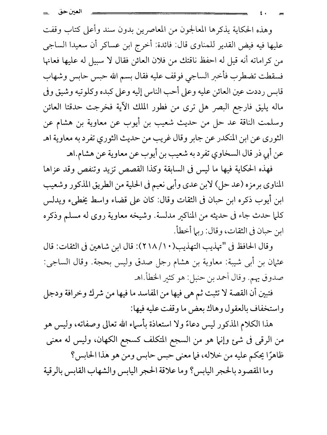 وهذه الحكاية يذكرها المعالجون من المعاصرين بدون سند وأعلى كتاب وقفت عليها فيه فيض القدير للمناوى قال: فائدة: أخرج ابن عساكر أن سعيدا الساجى من كراماته أنه قيل له احفظ ناقتك من فلان العائن فقال لا سبيل له عليها فعانها فسقطت تضطرب فأخبر الساجي فوقف عليه فقال بسم الله حبس حابس وشهاب قابس رددت عين العائن عليه وعلى أحب الناس إليه وعلى كبده وكلوتيه وشيق وفى ماله يليق فارجع البصر هل ترى من فطور الملك الآية فخرجت حدقتا العائن وسلمت الناقة عد حل من حديث شعيب بن أيوب عن معاوية بن هشام عن الثورى عن ابن المنكدر عن جابر وقال غريب من حديث الثوري تفرد به معاوية اهـ عن أبي ذر قال السخاوي تفرد به شعيب بن أيوب عن معاوية عن هشام. اهـ