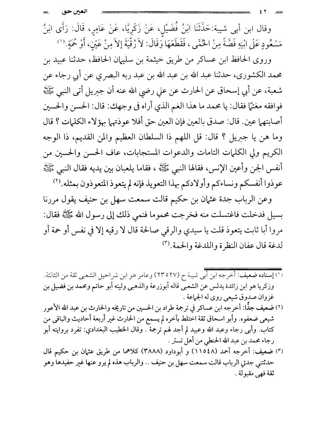 (¬1) إسناده ضعيف: أخرجه ابن أبى شيبة ح (23527) وعامر هو ابن شراحيل الشعبى ثقة من الثالثة. وزكريا هو ابن زائدة يدلس عن الشعبى قاله أبوزرعة والذهبى ولينه أبو حاتم ومحمد بن فضيل بن غزوان صدوق شيعى روى له الجماعة.